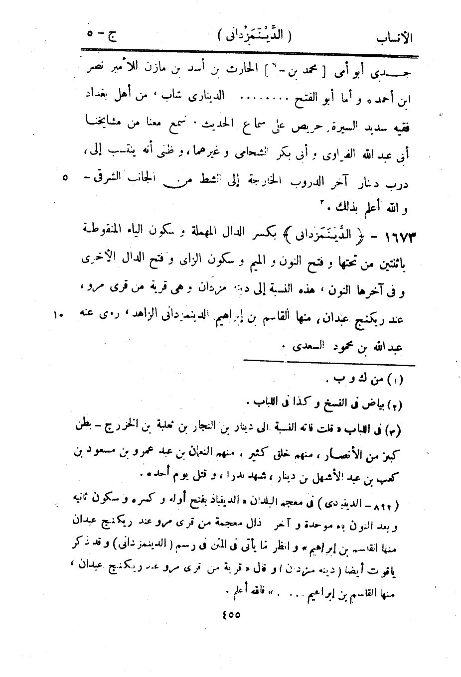 (892- الدينبادى) في معجم البلدان «الدينباذ بفتح أوله وكسره وسكون ثانيه وبعد النون باء موحدة وآخر ذال معجمة من قرى مرو عند ريكنج عبدان منها القاسم بن إبراهيم» وانظر ما يأتى في المتن في رسم (الدينمزدانى) وقد ذكر ياقوت أيضا (دينه مزدان) وقال «قرية من قرى مرو عند ريكنج عبدان، منها القاسم بن إبراهيم....» فاللَّه أعلم.