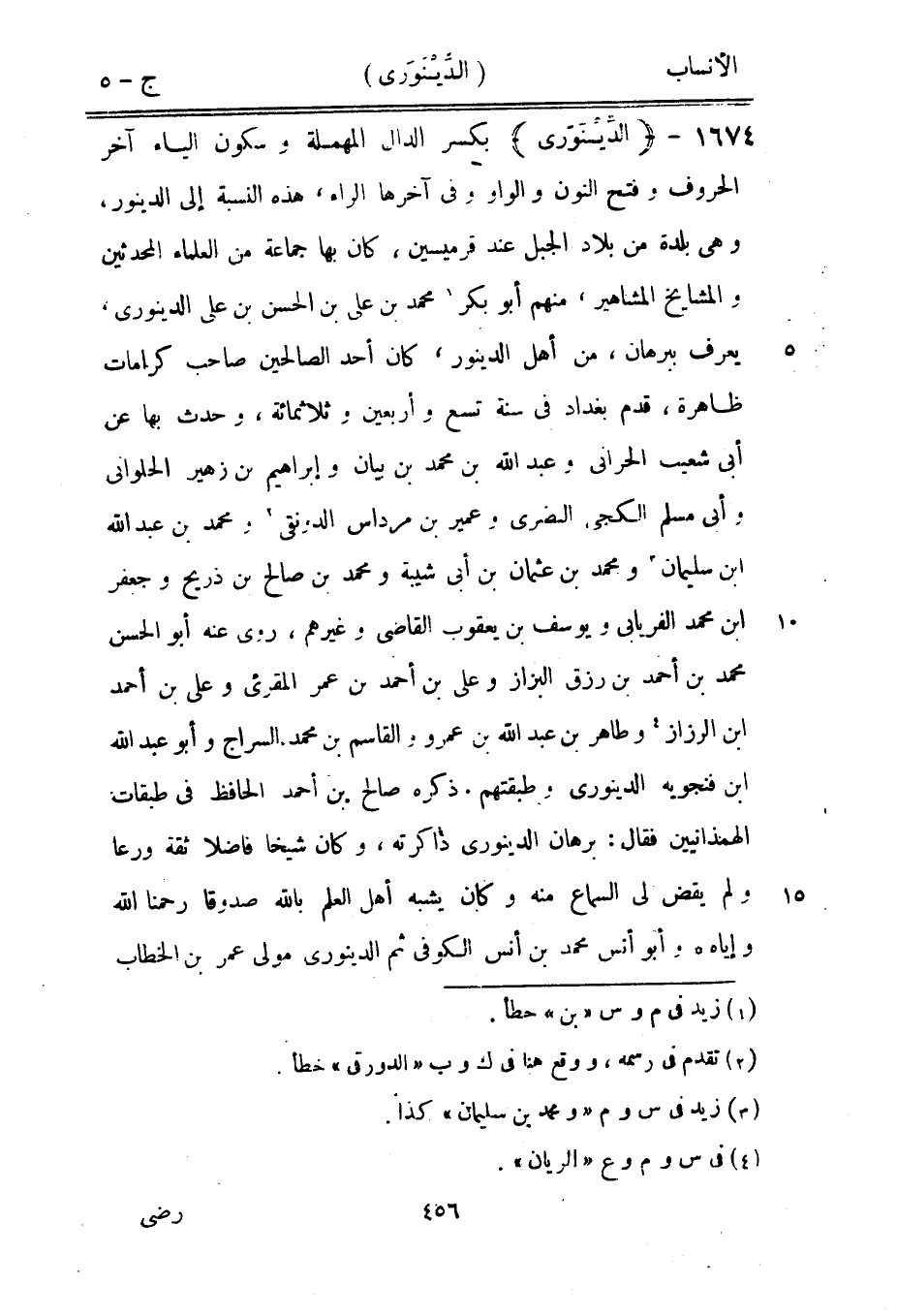 الهمذانيين فقال: برهان الدينَوَريّ ذاكرته، وكان شيخا فاضلا ثقة ورعا ولم يقض لي السماع منه وكان يشبه أهل العلم باللَّه صدوقا رحمنا الله وإياه وأبو أنس محمد بن أنس الكوفي ثم الدينَوَريّ مولى عمر بن الخطاب