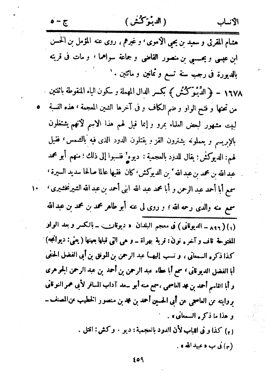بكسر الدال المهملة وسكون الياء المنقوطة باثنتين من تحتها وفتح الواو وضم الكاف وفي آخرها الشين المعجمة، هذه النسبة لبيت مشهور لبعض العلماء بمرو وإنما قيل لهم هذا الاسم لأنهم يشتغلون بالإبريسم ويعملونه يشترون القز ويقتلون الدود الّذي فيه بالشمس، فقيل لهم: الديوكش، يقال للدود بالعجمية: ديوه [2] فنسبوا إلى ذلك، منهم أبو محمد عبد الله بن محمد بن عبد الله [3] بن الديوكش، كان فقيها عالما صالحا سديد السيرة، سمع أبا أحمد عبد الرحمن وأبا محمد عبد الله ابني أحمد بن عبد الله الشيرنخشيرى، سمع منه والدي رحمه الله، وروى لي عنه أبو طاهر محمد بن محمد بن عبد الله