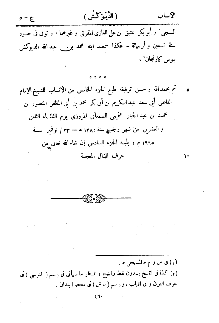 تم بحمد الله وحسن توفيقه طبع الجزء الخامس من الأنساب للشيخ الإمام القاضي أبى سعد عبد الكريم بن أبى بكر محمد بن أبى المظفر المنصور بن محمد بن عبد الجبار التميمي السمعاني المروزي يوم الثلثاء الثامن والعشرين من شهر رجب سنة 1385 هـ- 23/ نوفمبر سنة 1965 م ويليه الجزء السادس إن شاء الله تعالى من حرف الذال المعجمة