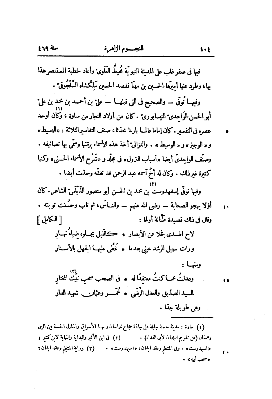 وفيها توفّى- والصحيح فى التى قبلها- علىّ بن أحمد بن محمد بن علىّ أبو الحسن الواحدىّ النيسابورىّ. كان من أولاد التجار من ساوة، وكان «1» أوحد عصره فى التفسير. كان إماما عالما بارعا محدّثا، صنف التفاسير الثلاثة: «البسيط» و «الوجيز» و «الوسيط» . والغزالىّ أخذ هذه الأسماء برمّتها وسمّى بها تصانيفه.