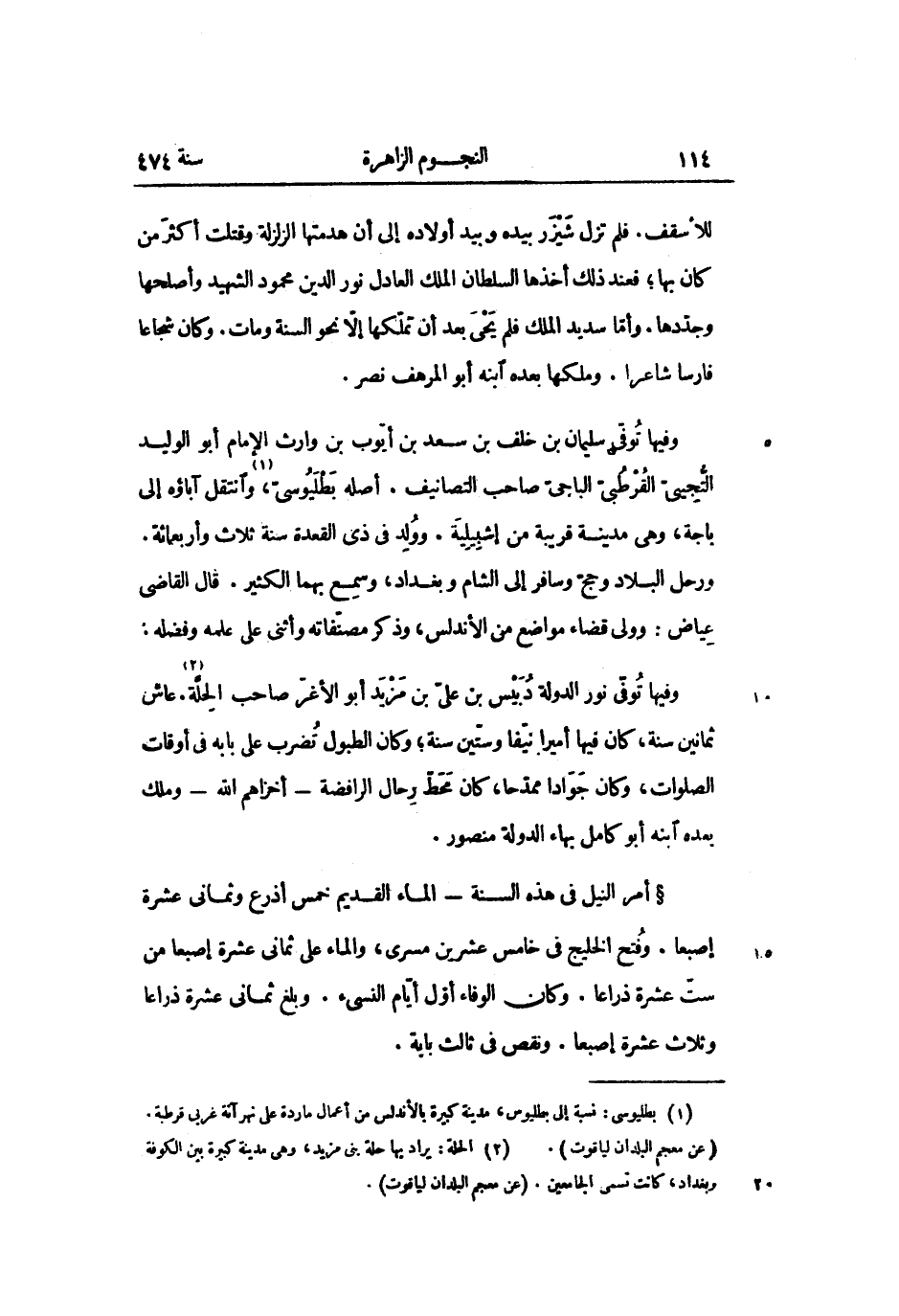 وفيها توفّى سليمان بن خلف بن سعد بن أيّوب بن وارث الإمام أبو الوليد التّجيبيّ القرطبىّ الباجىّ صاحب التصانيف. أصله بطليوسىّ، «1» وانتقل آباؤه إلى باجة، وهى مدينة قريبة من إشبيلية. وولد فى ذى القعدة سنة ثلاث وأربعمائة.