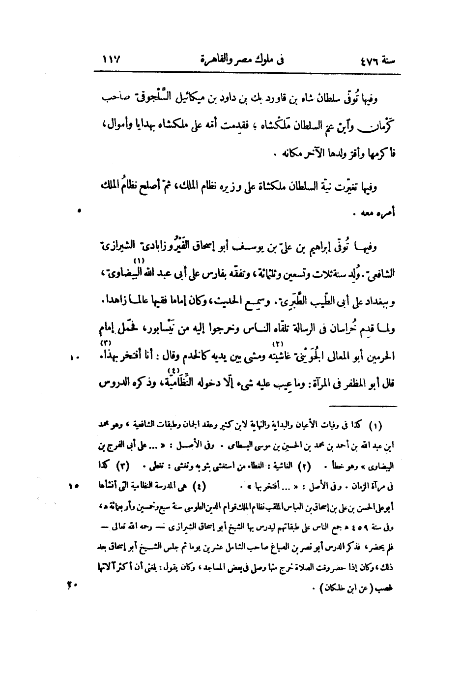 وفيها توفّى إبراهيم بن علىّ بن يوسف أبو إسحاق الفيروزابادىّ الشيرازىّ الشافعىّ. ولد سنة ثلاث وتسعين وثلثمائة، وتفقّه بفارس على أبى عبد الله «1» البيضاوىّ، وببغداد على أبى الطّيب الطّبرىّ. وسمع الحديث، وكان إماما فقيها عالما زاهدا.