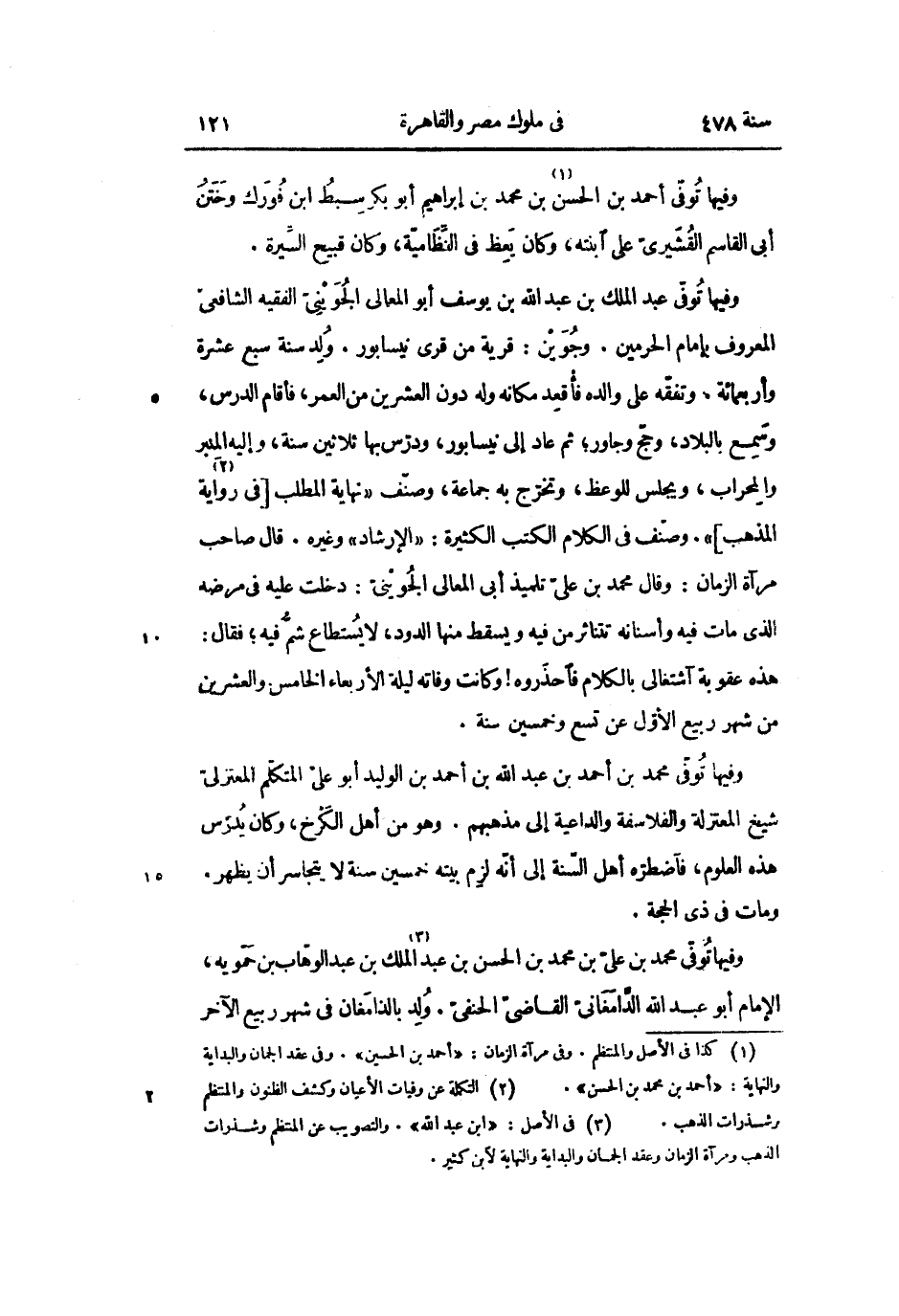 وفيها توفّى عبد الملك بن عبد الله بن يوسف أبو المعالى الجوينىّ الفقيه الشافعىّ المعروف بإمام الحرمين. وجوين: قرية من قرى نيسابور. ولد سنة سبع عشرة وأربعمائة، وتفقّه على والده فأقعد مكانه وله دون العشرين من العمر، فأقام الدرس، وسمع بالبلاد، وحجّ وجاور؛ ثم عاد إلى نيسابور، ودرّس بها ثلاثين سنة، وإليه المنبر والمحراب، ويجلس للوعظ، وتخرّج به جماعة، وصنّف «نهاية المطلب [فى رواية «2» المذهب] » . وصنّف فى الكلام الكتب الكثيرة: «الإرشاد» وغيره. قال صاحب مرآة الزمان: وقال محمد بن علىّ تلميذ أبى المعالى الجوينىّ: دخلت عليه فى مرضه الذي مات فيه وأسنانه تتناثر من فيه ويسقط منها الدود، لا يستطاع شمّ فيه؛ فقال: