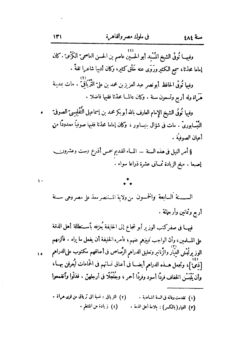 فيها فى صفر كتب الوزير أبو شجاع إلى الخليفة يعرّفه باستطالة أهل الذمّة على المسلمين، وأنّ الواجب تمييزهم عنهم؛ فأمره الخليفة أن يفعل ما يراه. فألزمهم الوزير لبش الغيّار «3» والزّنانير وتعليق الدراهم الرّصاص فى أعناقهم مكتوب على الدراهم [ذمىّ «4» ] ، وتجعل هذه الدراهم أيضا فى أعناق نسائهم فى الحمّامات ليعرفن بها، وأن يلبسن الخفاف فردا أسود وفردا أحمر، وجلجلا فى أرجلهنّ. فذلّوا وانقمعوا