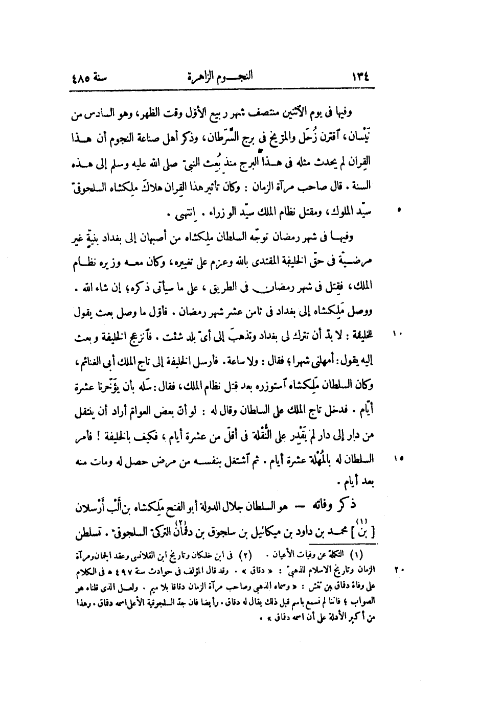 وفيها فى شهر رمضان توجّه السلطان ملكشاه من أصبهان إلى بغداد بنيّة غير مرضيّة فى حقّ الخليفة المقتدى بالله وعزم على تغييره، وكان معه وزيره نظام الملك، فقتل فى شهر رمضان فى الطريق، على ما سيأتى ذكره؛ إن شاء الله.