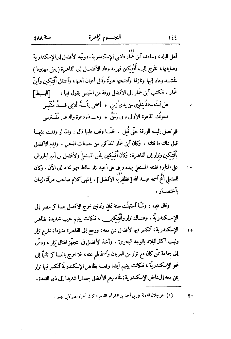أهل البلد، وساعده ابن عمّار «1» قاضى الإسكندرية. فتوجّه الأفضل إلى الإسكندرية وضايقها؛ فخرج إليه أفتكين فهزمه وعاد الأفضل إلى القاهرة (يعنى مهزوما) فحشد وعاد إليها ونازلها وافتتحها عنوة وقتل أعيان أهلها، واعتقل أفتكين وابن عمّار. فكتب ابن عمّار إلى الأفضل ورقة من الحبس يقول فيها: