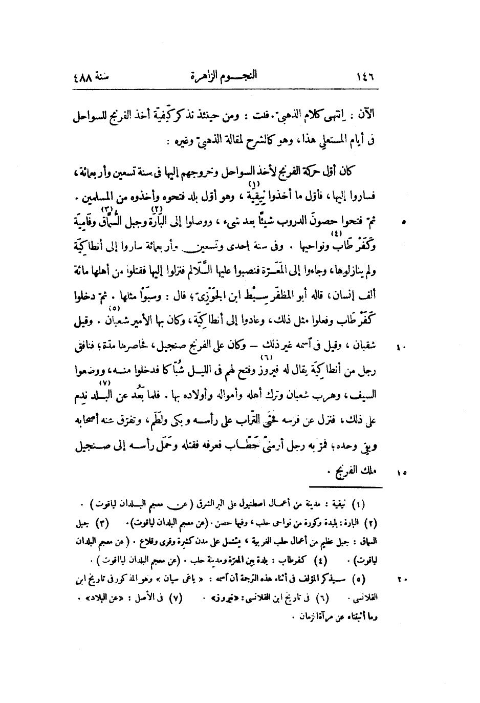الآن: انتهى كلام الذهبىّ. قلت: ومن حينئذ نذكر كيفيّة أخذ الفرنج للسواحل فى أيام المستعلى هذا، وهو كالشرح لمقالة الذهبىّ وغيره: