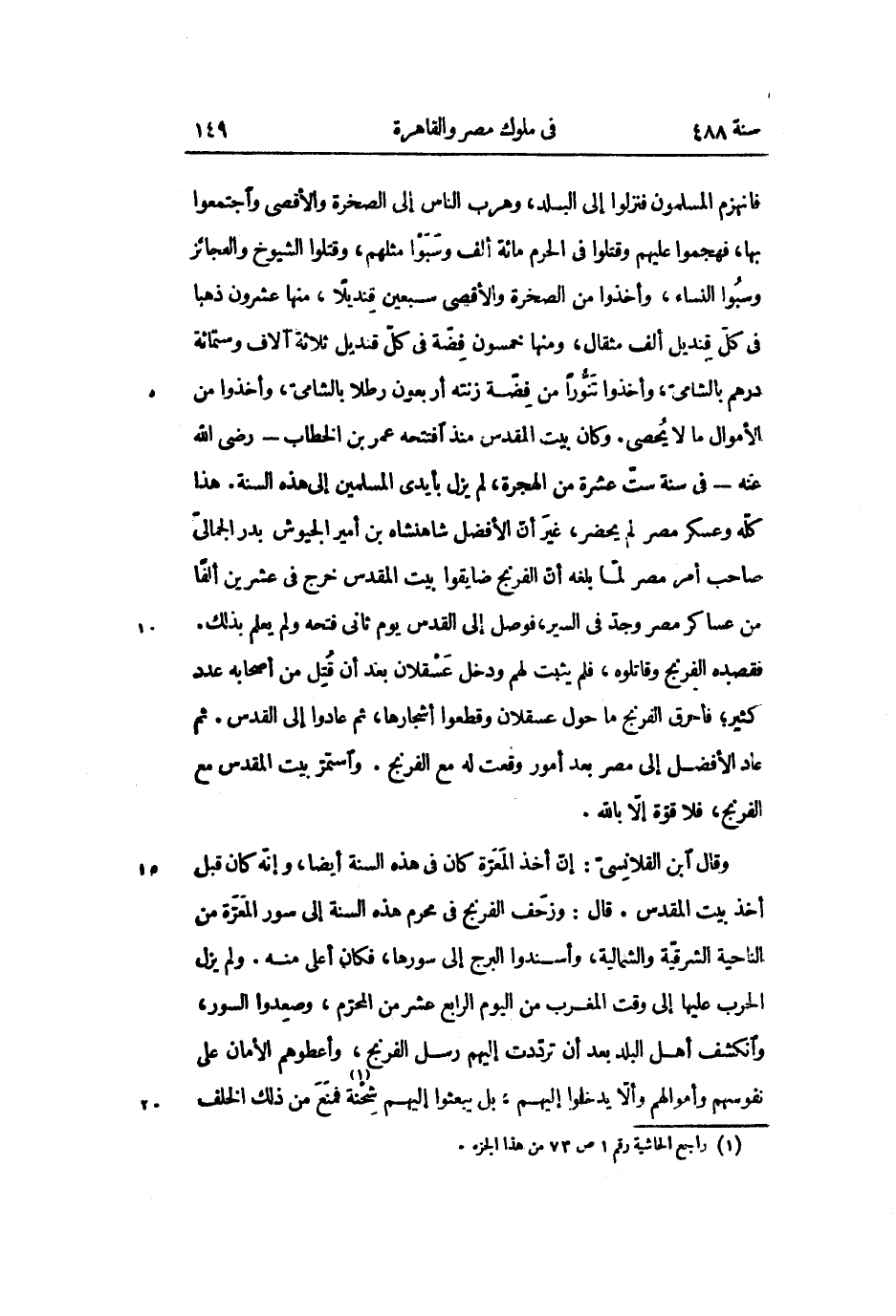 فانهزم المسلمون فنزلوا إلى البلد، وهرب الناس إلى الصخرة والأقصى واجتمعوا بها، فهجموا عليهم وقتلوا فى الحرم مائة ألف وسبوا مثلهم، وقتلوا الشيوخ والعجائز وسبوا النساء، وأخذوا من الصخرة والأقصى سبعين قنديلا، منها عشرون ذهبا فى كلّ قنديل ألف مثقال، ومنها خمسون فضّة فى كلّ قنديل ثلاثة آلاف وستمائة درهم بالشامىّ، وأخذوا تنّورا من فضّة زنته أربعون رطلا بالشامىّ، وأخذوا من الأموال ما لا يحصى. وكان بيت المقدس منذ افتتحه عمر بن الخطاب- رضى الله عنه- فى سنة ستّ عشرة من الهجرة، لم يزل بأيدى المسلمين إلى هذه السنة. هذا كلّه وعسكر مصر لم يحضر، غير أنّ الأفضل شاهنشاه بن أمير الجيوش بدر الجمالىّ صاحب أمر مصر لمّا بلغه أنّ الفرنج ضايقوا بيت المقدس خرج فى عشرين ألفا من عساكر مصر وجدّ فى السير، فوصل إلى القدس يوم ثانى فتحه ولم يعلم بذلك.