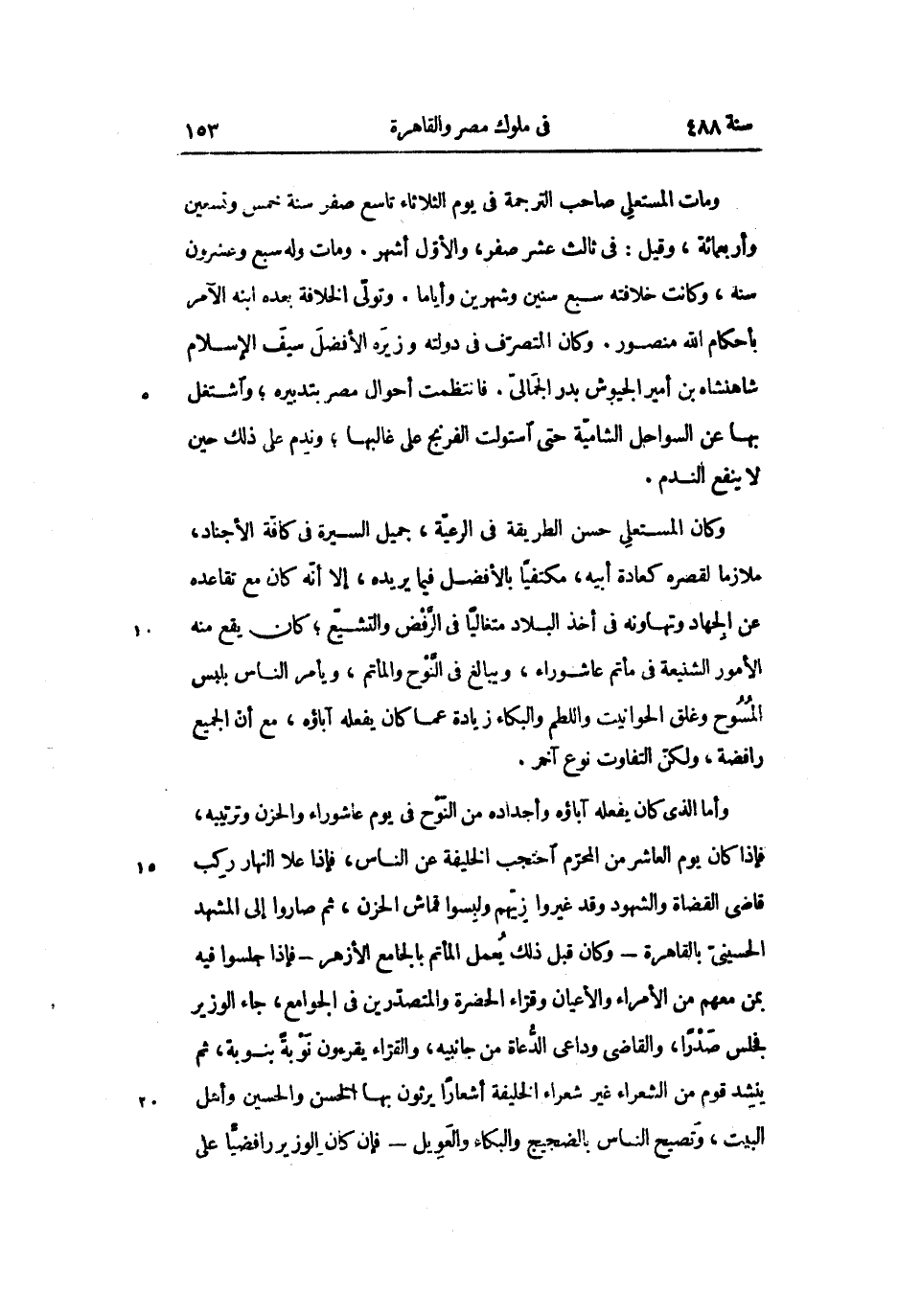 وأما الذي كان يفعله آباؤه وأجداده من النّوح فى يوم عاشوراء والحزن وترتيبه، فإذا كان يوم العاشر من المحرّم احتجب الخليفة عن الناس، فإذا علا النهار ركب قاضى القضاة والشهود وقد غيروا زيّهم ولبسوا قماش الحزن، ثم صاروا إلى المشهد الحسينىّ بالقاهرة- وكان قبل ذلك يعمل المأتم بالجامع الأزهر- فإذا جلسوا فيه بمن معهم من الأمراء والأعيان وقرّاء الحضرة والمتصدّرين فى الجوامع، جاء الوزير فجلس صدرا، والقاضى وداعى الدّعاة من جانبيه، والقرّاء يقرءون نوبة بنوبة، ثم ينشد قوم من الشعراء غير شعراء الخليفة أشعارا يرثون بها الحسن والحسين وأهل البيت، وتصيح الناس بالضجيج والبكاء والعويل- فإن كان الوزير رافضيّا على