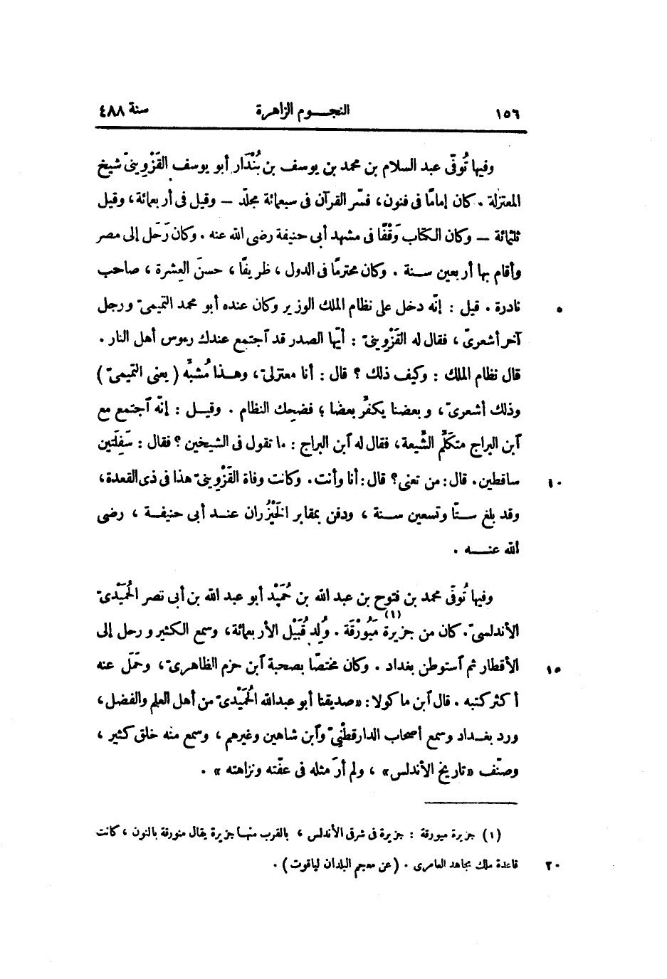 وفيها توفّى محمد بن فتوح بن عبد الله بن حميد أبو عبد الله بن أبى نصر الحميدىّ الأندلسىّ. كان من جزيرة «1» ميورقة. ولد قبيل الأربعمائة، وسمع الكثير ورحل إلى الأقطار ثم استوطن بغداد. وكان مختصّا بصحبة ابن حزم الظاهرىّ، وحمل عنه أكثر كتبه. قال ابن ماكولا: «صديقنا أبو عبد الله الحميدىّ من أهل العلم والفضل، ورد بغداد وسمع أصحاب الدارقطنىّ وابن شاهين وغيرهم، وسمع منه خلق كثير، وصنّف «تاريخ الأندلس» ، ولم أر مثله فى عفّته ونزاهته» .