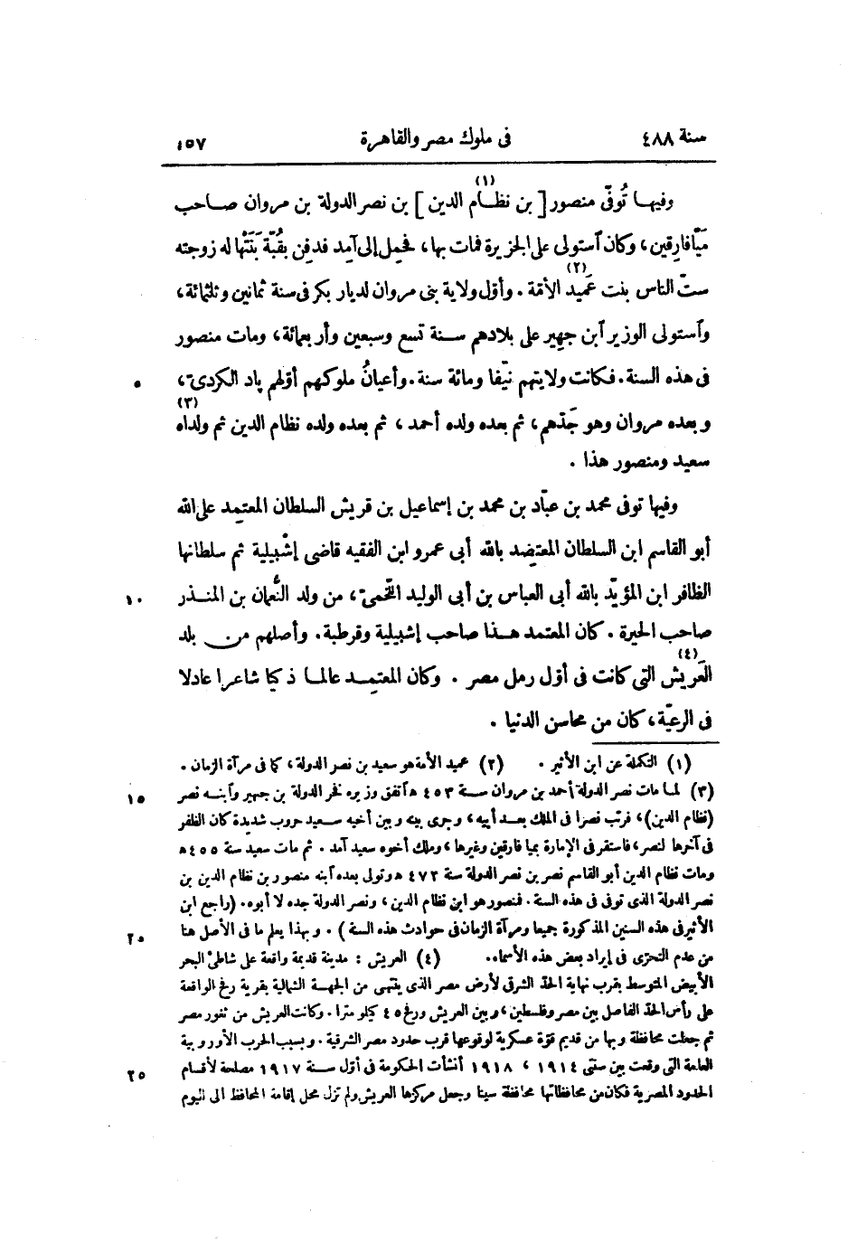 وفيها توفّى منصور [بن نظام «1» الدين] بن نصر الدولة بن مروان صاحب ميّافارقين، وكان استولى على الجزيرة فمات بها، فحمل إلى آمد فدفن بقبّة بنتها له زوجته ستّ الناس بنت عميد «2» الأمّة. وأوّل ولاية بنى مروان لديار بكر فى سنة ثمانين وثلثمائة، واستولى الوزير ابن جهير على بلادهم سنة تسع وسبعين وأربعمائة، ومات منصور فى هذه السنة. فكانت ولايتهم نيّفا ومائة سنة. وأعيان ملوكهم أوّلهم پاد الكردىّ، وبعده مروان وهو جدّهم، ثم بعده ولده أحمد، ثم بعده ولده نظام الدين ثم ولداه «3» سعيد ومنصور هذا.