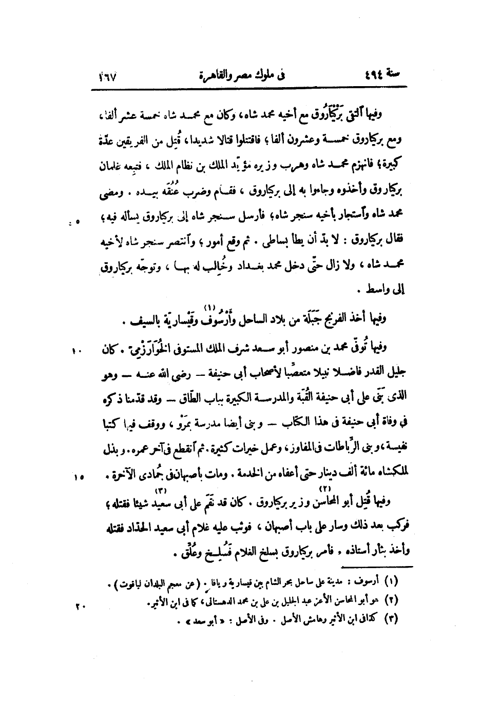 وفيها قتل أبو المحاسن «2» وزير بركياروق. كان قد نقم على أبى سعيد «3» شيئا فقتله؛ فركب بعد ذلك وسار على باب أصبهان، فوثب عليه غلام أبى سعيد الحدّاد فقتله وأخذ بثأر أستاذه. فأمر بركياروق بسلخ الغلام فسلخ وعلّق.