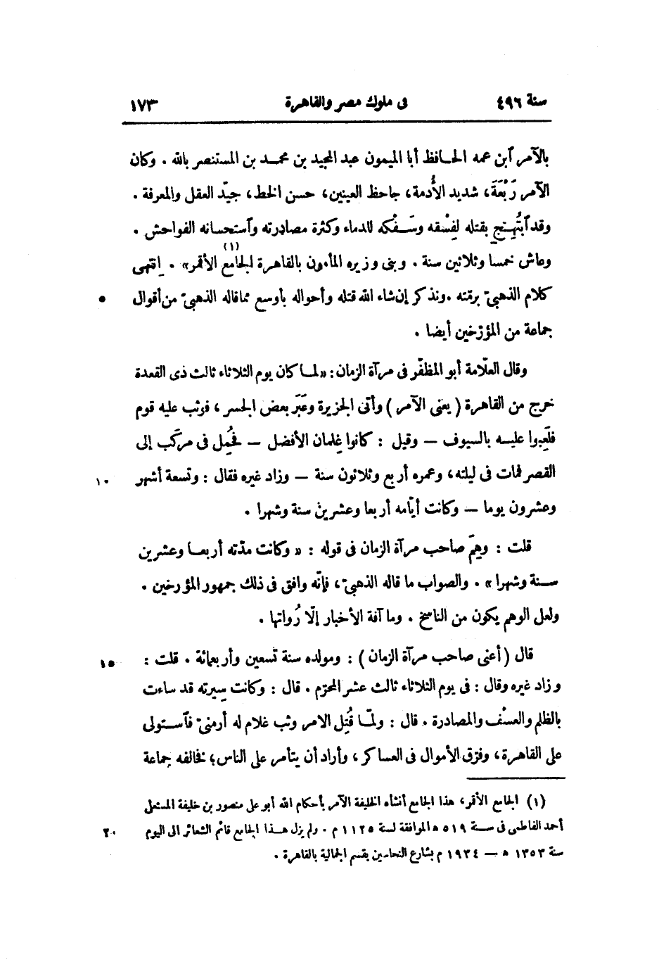 وعاش خمسا وثلاثين سنة. وبنى وزيره المأمون بالقاهرة الجامع «1» الأقمر» . انتهى كلام الذهبىّ برمّته. ونذكر إن شاء الله قتله وأحواله بأوسع مما قاله الذهبىّ من أقوال جماعة من المؤرّخين أيضا.