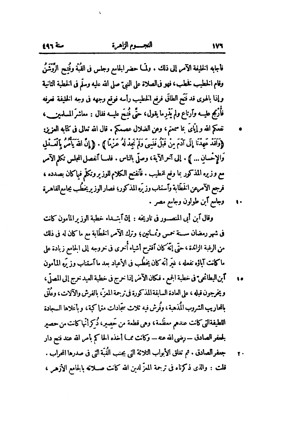 . إلى آخر الآية، وصلّى بالناس. فلما انفصل المجلس تكلم الآمر مع وزيره المذكور بما وقع للخطيب. فانفتح الكلام للوزير وتكلّم فيما كان بصدده، فرجع الآمر عن الخطّابة واستناب وزيره المذكور؛ فصار الوزير يخطب بجامع القاهرة وجامع ابن طولون وجامع مصر.