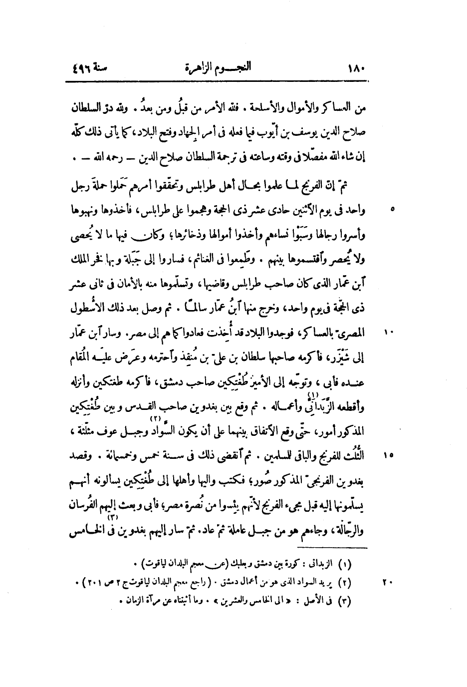 ثمّ إنّ الفرنج لما علموا بحال أهل طرابلس وتحقّقوا أمرهم حملوا حملة رجل واحد فى يوم الاثنين حادى عشر ذى الحجة وهجموا على طرابلس، فأخذوها ونهبوها وأسروا رجالها وسبوا نساءهم وأخذوا أموالها وذخائرها؛ وكان فيها ما لا يحصى ولا يحصر واقتسموها بينهم. وطمعوا فى الغنائم، فساروا إلى جبلة وبها فخر الملك ابن عمّار الذي كان صاحب طرابلس وقاضيها، وتسلّموها منه بالأمان فى ثانى عشر ذى الحجّة فى يوم واحد، وخرج منها ابن عمّار سالما. ثم وصل بعد ذلك الأسطول المصرىّ بالعساكر، فوجدوا البلاد قد أخذت فعادوا كما هم إلى مصر. وسار ابن عمّار إلى شيزر، فأكرمه صاحبها سلطان بن علىّ بن منقذ واحترمه وعرض عليه المقام عنده فأبى، وتوجّه إلى الأمير طغتكين صاحب دمشق، فأكرمه طغتكين وأنزله وأقطعه الزّبدانىّ «1» وأعماله. ثم وقع بين بغدوين صاحب القدس وبين طغتكين المذكور أمور، حتّى وقع الاتفاق بينهما على أن يكون السّواد «2» وجبل عوف مثلّثة، الثّلث للفرنج والباقى للمسلمين. ثم انقضى ذلك فى سنة خمس وخمسائة. وقصد بغدوين الفرنجىّ المذكور صور؛ فكتب واليها وأهلها إلى طغتكين يسألونه أنهم يسلّمونها إليه قبل مجىء الفرنج لأنّهم يئسوا من نصرة مصر؛ فأبى وبعث إليهم الفرسان والرّجالة، وجاءهم هو من جبل عاملة ثمّ عاد. ثمّ سار إليهم بغدوين فى «3» الخامس