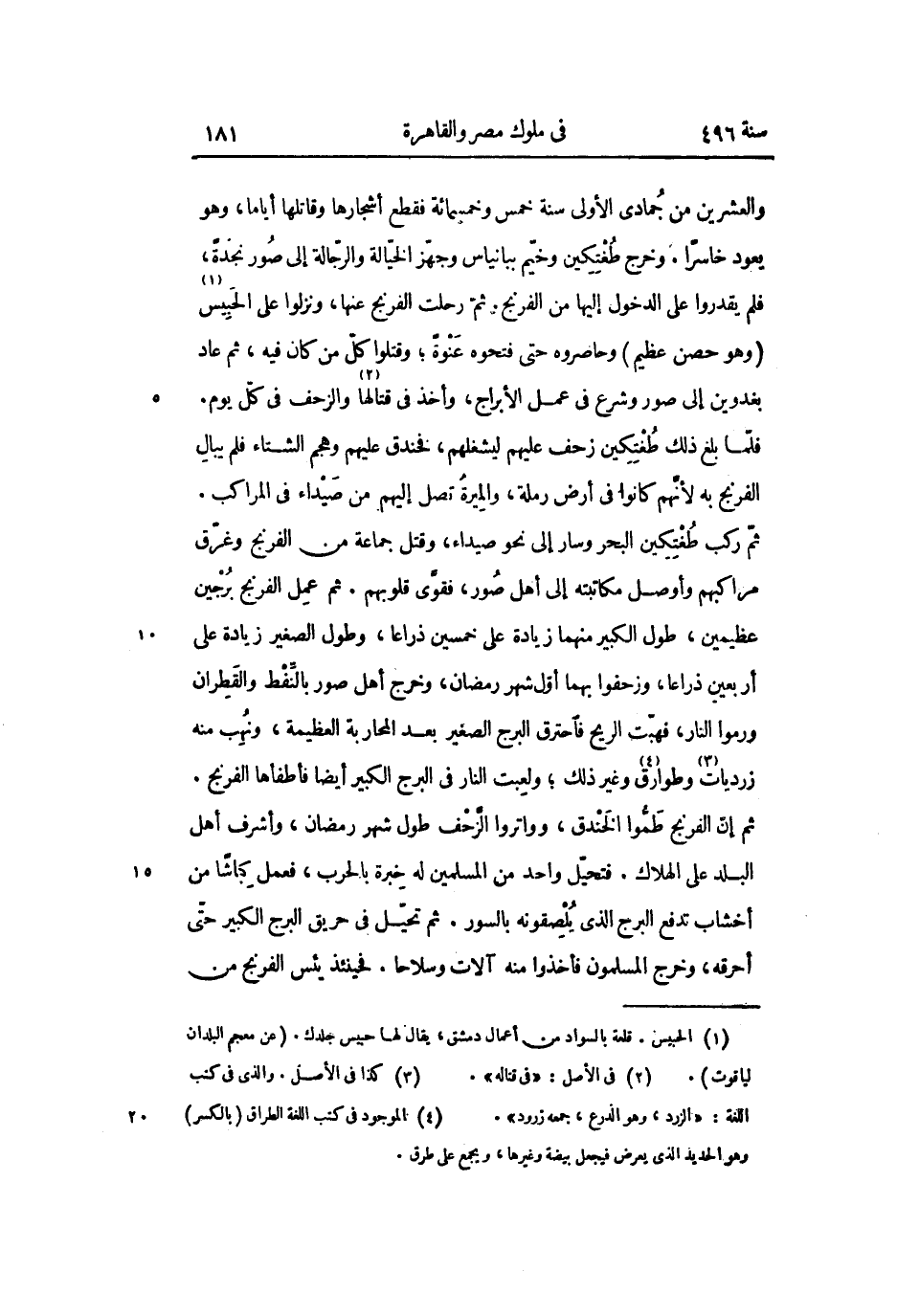 ثمّ ركب طغتكين البحر وسار إلى نحو صيداء، وقتل جماعة من الفرنج وغرّق مراكبهم وأوصل مكاتبته إلى أهل صور، فقوّى قلوبهم. ثم عمل الفرنج برجين عظيمين، طول الكبير منهما زيادة على خمسين ذراعا، وطول الصغير زيادة على أربعين ذراعا، وزحفوا بهما أوّل شهر رمضان، وخرج أهل صور بالنّفط والقطران ورموا النار، فهبّت الريح فاحترق البرج الصغير بعد المحاربة العظيمة، ونهب منه زرديات «3» وطوارق «4» وغير ذلك؛ ولعبت النار فى البرج الكبير أيضا فأطفأها الفرنج.