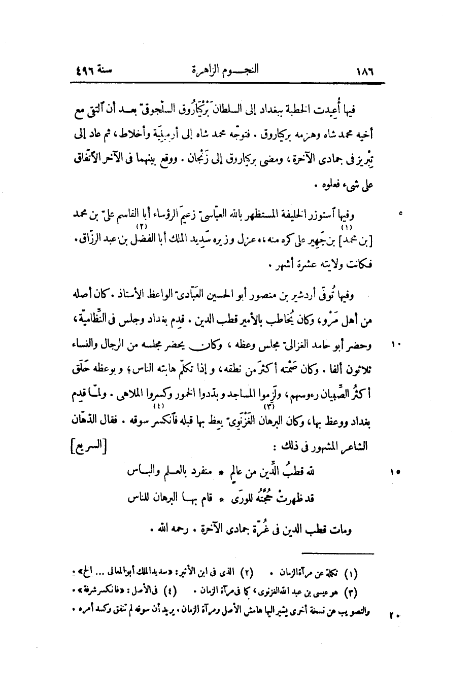 وفيها توفّى أردشير بن منصور أبو الحسين العبّادىّ الواعظ الأستاذ. كان أصله من أهل مرو، وكان يخاطب بالأمير قطب الدين. قدم بغداد وجلس فى النّظاميّة، وحضر أبو حامد الغزالىّ مجلس وعظه، وكان يحضر مجلسه من الرجال والنساء ثلاثون ألفا. وكان صمته أكثر من نطقه، وإذا تكلّم هابته الناس؛ وبوعظه حلق أكثر الصّبيان رءوسهم، ولزموا المساجد وبدّدوا الخمور وكسروا الملاهى. ولمّا قدم بغداد ووعظ بها، وكان البرهان «3» الغزنوىّ يعظ بها قبله فانكسر «4» سوقه. فقال الدّهّان الشاعر المشهور فى ذلك: