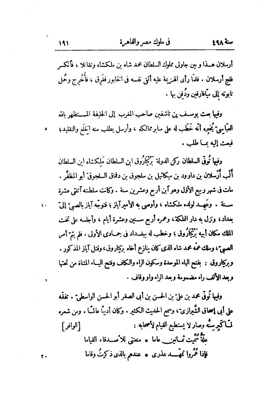 وفيها توفّى السلطان ركن الدولة بركياروق ابن السلطان ملكشاه ابن السلطان ألب أرسلان بن داوود بن ميكائيل بن سلجوق بن دقماق السلجوقىّ أبو المظفّر.