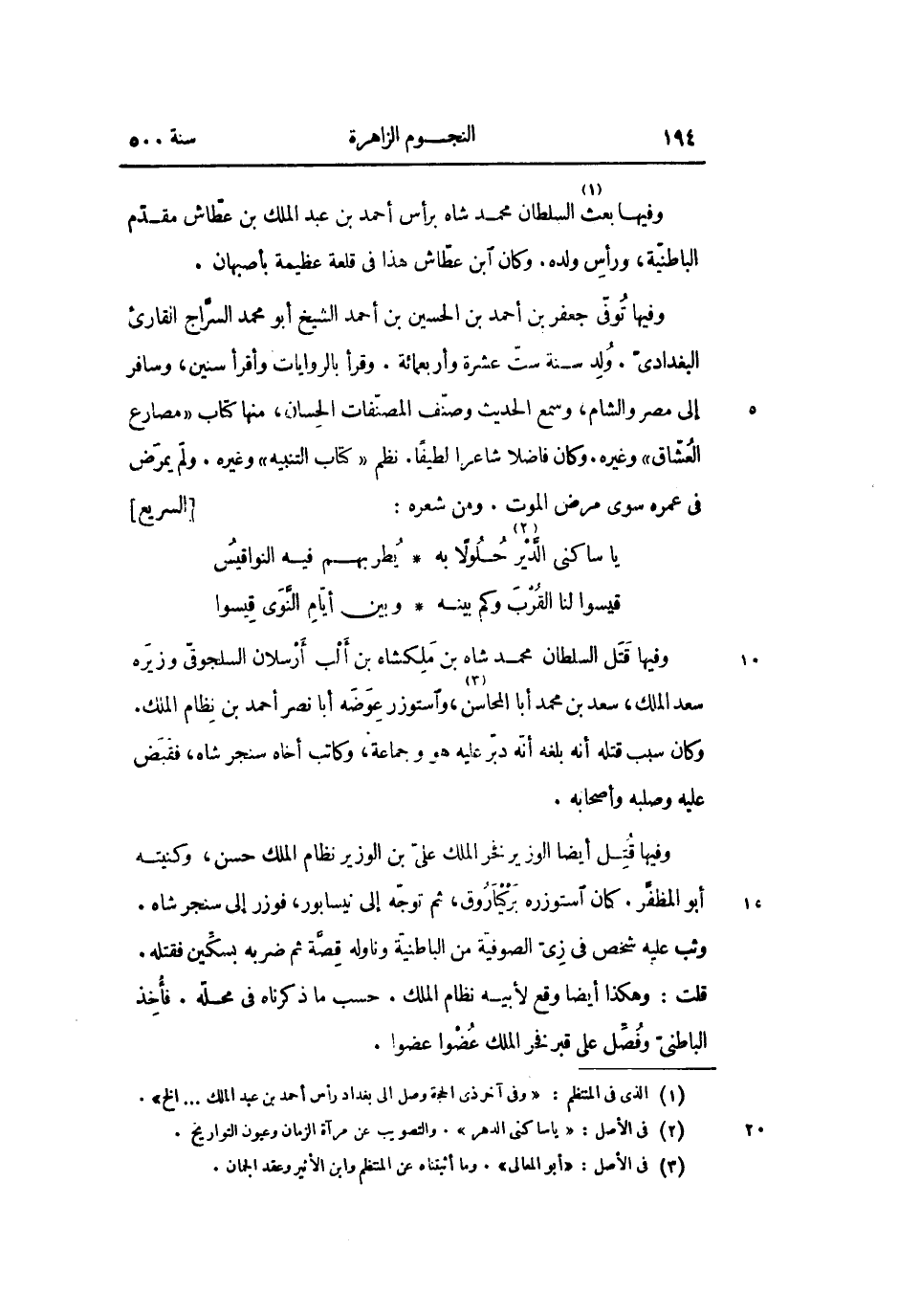 وفيها توفّى جعفر بن أحمد بن الحسين بن أحمد الشيخ أبو محمد السّراج القارئ البغدادىّ. ولد سنة ستّ عشرة وأربعمائة. وقرأ بالروايات وأقرأ سنين، وسافر إلى مصر والشام، وسمع الحديث وصنّف المصنّفات الحسان، منها كتاب «مصارع العشّاق» وغيره. وكان فاضلا شاعرا لطيفا. نظم «كتاب التنبيه» وغيره. ولم يمرض فى عمره سوى مرض الموت. ومن شعره: