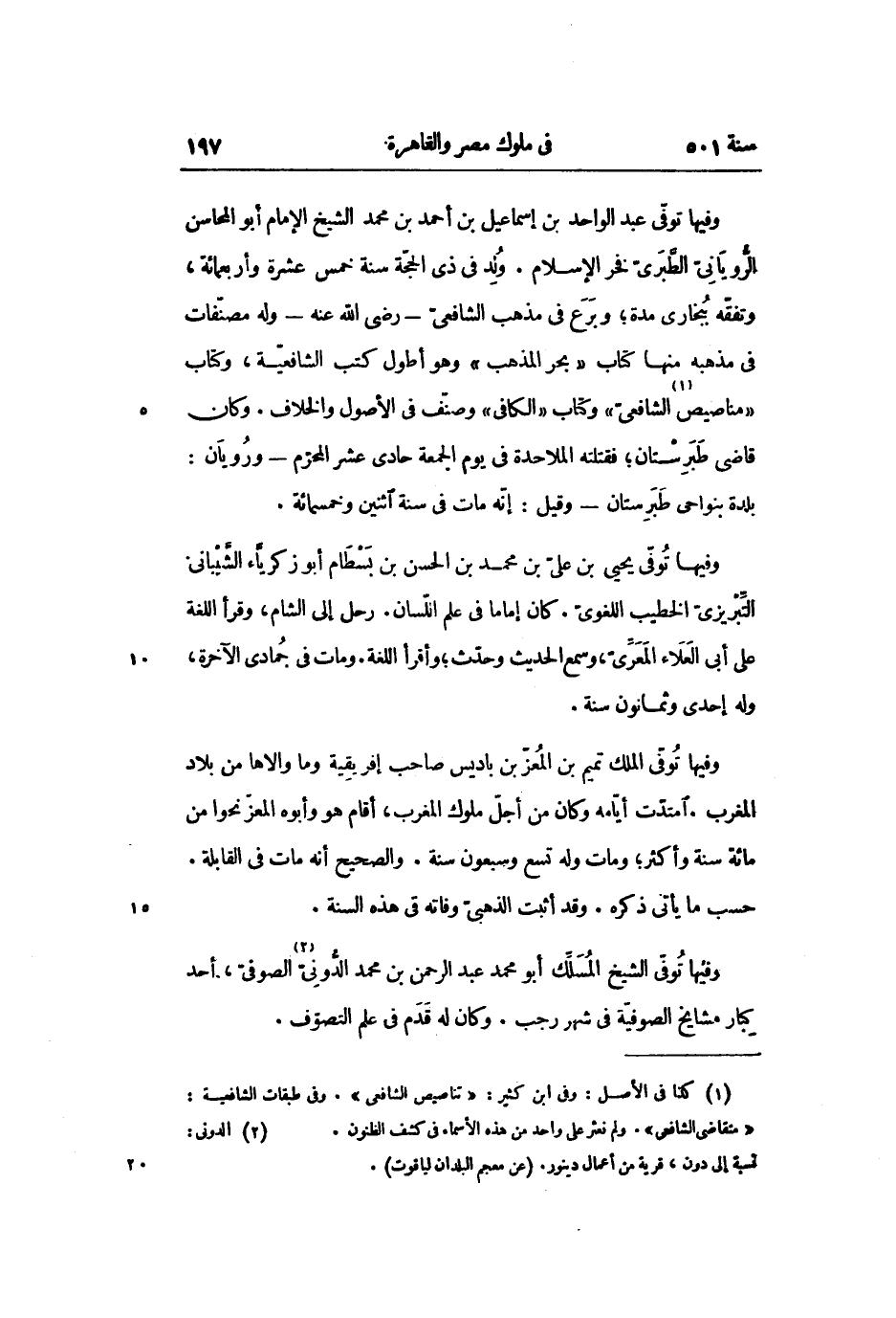 وفيها توفّى عبد الواحد بن إسماعيل بن أحمد بن محمد الشيخ الإمام أبو المحاسن الرّويانىّ الطّبرىّ فخر الإسلام. ولد فى ذى الحجّة سنة خمس عشرة وأربعمائة، وتفقّه ببخارى مدة؛ وبرع فى مذهب الشافعىّ- رضى الله عنه- وله مصنّفات فى مذهبه منها كتاب «بحر المذهب» وهو أطول كتب الشافعيّة، وكتاب «مناصيص «1» الشافعىّ» وكتاب «الكافى» وصنّف فى الأصول والخلاف. وكان قاضى طبرستان؛ فقتلته الملاحدة فى يوم الجمعة حادى عشر المحرّم- ورويان: