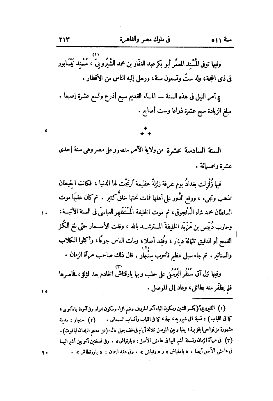 فيها زلزلت بغداد يوم عرفة زلزلة عظيمة ارتجّت لها الدنيا؛ فكانت الحيطان تذهب وتجىء، ووقع الدّور على أهلها فمات تحتها خلق كثير. ثم كان عقبها موت السلطان محمد شاه السّلجوقى، ثم موت الخليفة المستظهر العباسىّ فى السنة الآتية، وحارب دبيس بن مزيد الخليفة المسترشد بالله، وغلت الأسعار حتى بلغ الكرّ القمح أو الدقيق ثلثمائة دينار، وفقد أصلا، ومات الناس جوعا، وأكلوا الكلاب والسنانير. ثم جاء سيل عظيم فأخرب سنجار «2» . قال ذلك صاحب مرآة الزمان.
