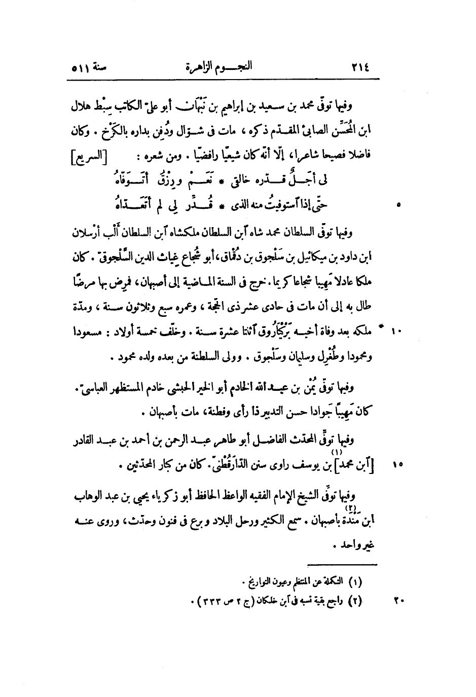وفيها توفّى السلطان محمد شاه ابن السلطان ملكشاه ابن السلطان ألب أرسلان ابن داود بن ميكائيل بن سلجوق بن دقماق، أبو شجاع غياث الدين السّلجوقىّ. كان ملكا عادلا مهيبا شجاعا كريما. خرج فى السنة الماضية إلى أصبهان، فمرض بها مرضا طال به إلى أن مات فى حادى عشر ذى الحجّة، وعمره سبع وثلاثون سنة، ومدّة ملكه بعد وفاة أخيه بركياروق اثنتا عشرة سنة. وخلّف خمسة أولاد: مسعودا ومحمودا وطغرل وسليمان وسلجوق. وولى السلطنة من بعده ولده محمود.