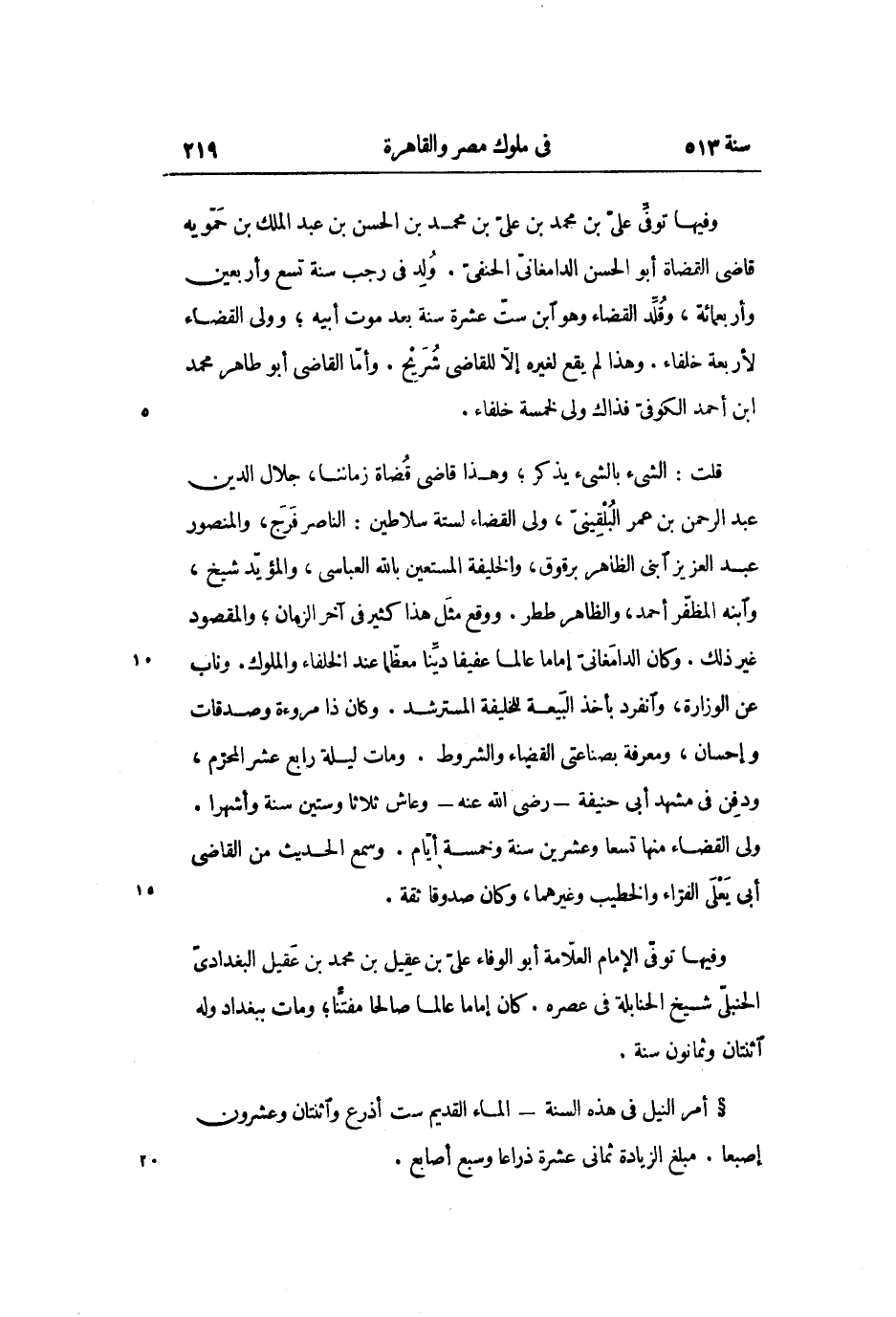 وفيها توفّى الإمام العلّامة أبو الوفاء علىّ بن عقيل بن محمد بن عقيل البغدادىّ الحنبلىّ شيخ الحنابلة فى عصره. كان إماما عالما صالحا مفتنّا؛ ومات ببغداد وله اثنتان وثمانون سنة.