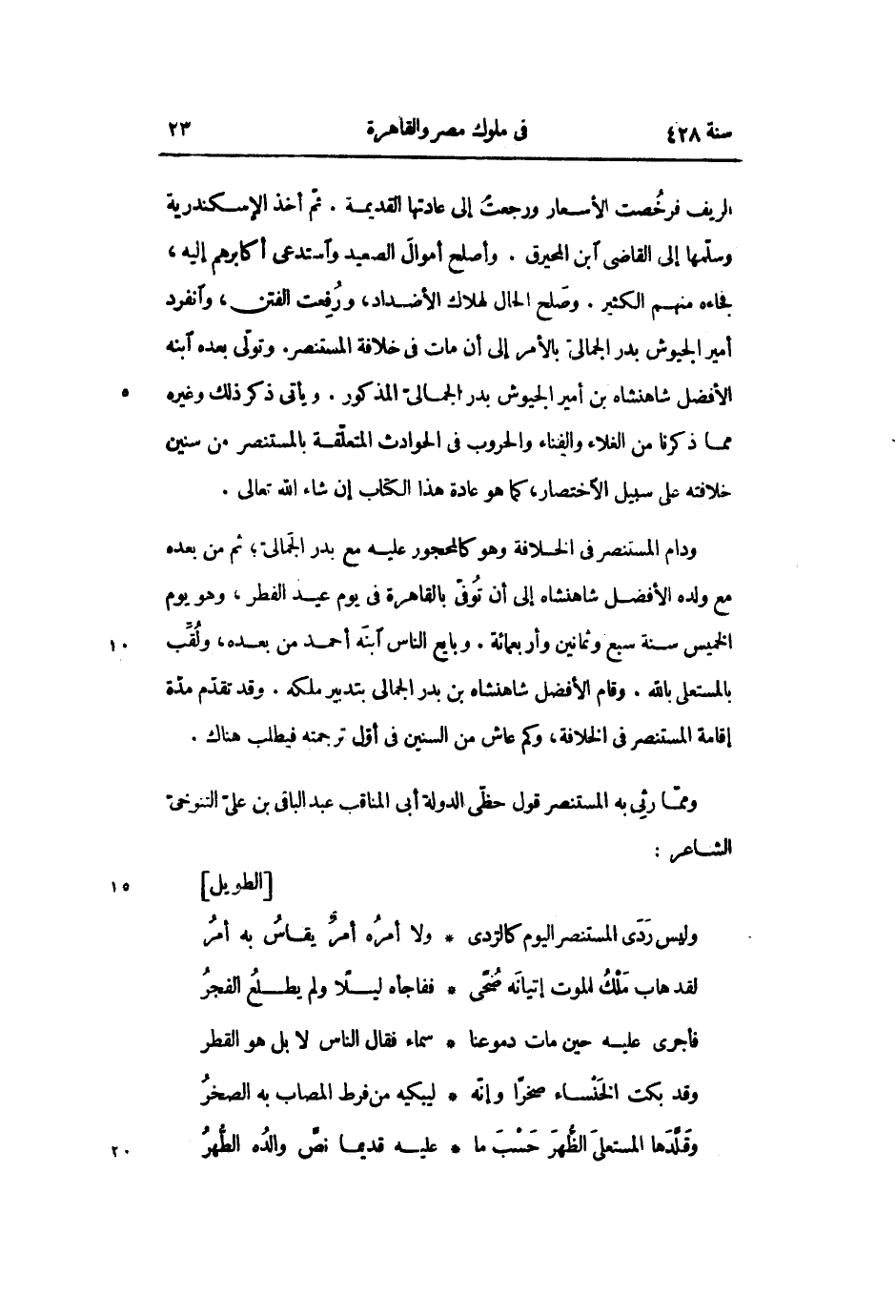 الريف فرخصت الأسعار ورجعت إلى عادتها القديمة. ثمّ أخذ الإسكندرية وسلّمها إلى القاضى ابن المحيرق. وأصلح أموال الصعيد واستدعى أكابرهم إليه، فجاءه منهم الكثير. وصلح الحال لهلاك الأضداد، ورفعت الفتن، وانفرد أمير الجيوش بدر الجمالىّ بالأمر إلى أن مات فى خلافة المستنصر. وتولّى بعده ابنه الأفضل شاهنشاه بن أمير الجيوش بدر الجمالىّ المذكور. ويأتى ذكر ذلك وغيره مما ذكرنا من الغلاء والفناء والحروب فى الحوادث المتعلّقة بالمستنصر من سنين خلافته على سبيل الاختصار، كما هو عادة هذا الكتاب إن شاء الله تعالى.