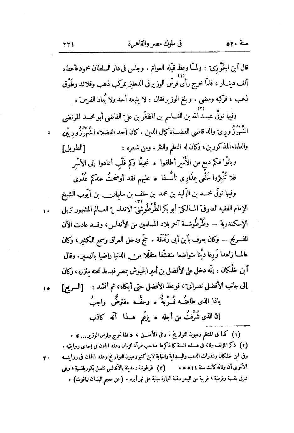 وفيها توفّى محمد بن الوليد بن محمد بن خلف بن سليمان بن أيّوب الشيخ الإمام الفقيه الصوفىّ المالكىّ أبو بكر الطّرطوشنىّ «3» الاندلسىّ العالم المشهور نزيل الإسكندرية- وطرطوشة آخر بلاد المسلمين من الأندلس، وقد عادت الآن للفرنج- وكان يعرف بابن أبى رندقة. حجّ ودخل العراق وسمع الكثير، وكان عالما زاهدا ورعا ديّنا متواضعا متقشّفا متقلّلا من الدنيا راضيا باليسير. وقال ابن خلّكان: إنّه دخل على الأفضل بن أمير الجيوش بمصر فبسط تحته مئزره، وكان إلى جانب الأفضل نصرانىّ، فوعظ الأفضل حتى أبكاه، ثم أنشد: