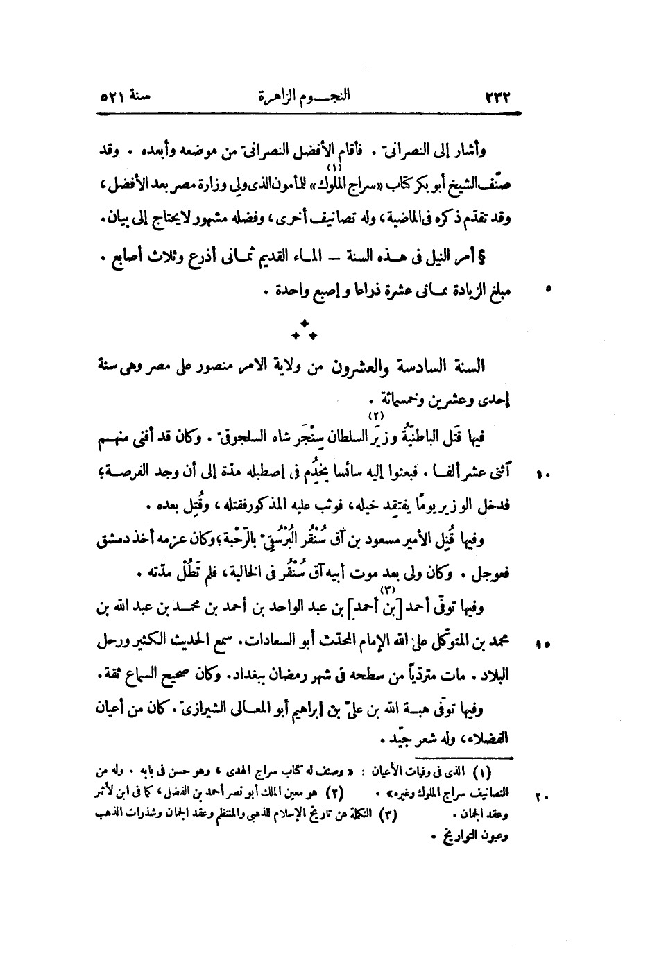وأشار إلى النصرانىّ. فأقام الأفضل النصرانىّ من موضعه وأبعده. وقد صنّف الشيخ أبو بكر كتاب «سراج الملوك «1» » للمأمون الذي ولى وزارة مصر بعد الأفضل، وقد تقدّم ذكره فى الماضية، وله تصانيف أخرى، وفضله مشهور لا يحتاج إلى بيان.