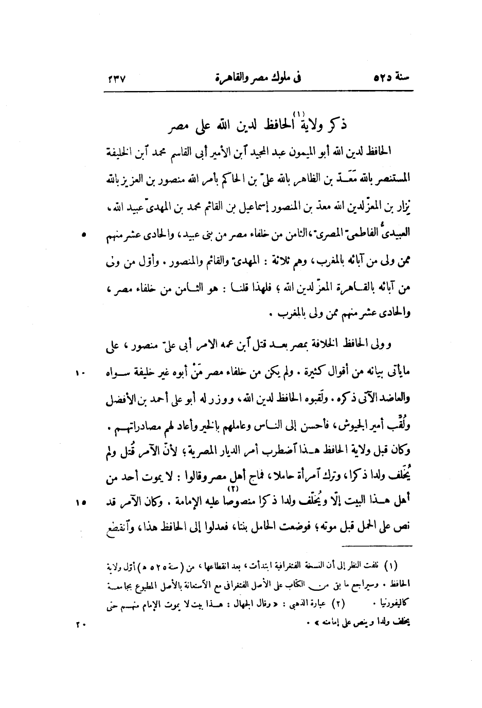 وكان قبل ولاية الحافظ هذا اضطرب أمر الديار المصرية؛ لأنّ الآمر قتل ولم يخلف ولدا ذكرا، وترك امرأة حاملا، فماج أهل مصر وقالوا: لا يموت أحد من أهل هذا البيت إلّا ويخلّف ولدا ذكرا منصوصا «2» عليه الإمامة. وكان الآمر قد نص على الحمل قبل موته؛ فوضعت الحامل بنتا، فعدلوا إلى الحافظ هذا، وانقضع