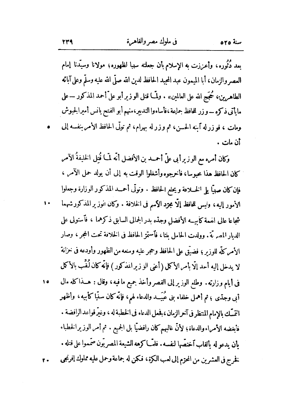 بعد دثوره، وأعززت به الإسلام بأن جعلته سببا لظهوره؛ مولانا وسيّدنا إمام العصر والزمان، أبا الميمون عبد المجيد الحافظ لدين الله صلّى الله عليه وسلّم وعلى آبائه الطاهرين، حجج الله على العالمين» . ولمّا قتل الوزير أبو علىّ أحمد المذكور- على ما يأتى ذكره- وزر للحافظ جماعة، فأساءوا التدبير، منهم أبو الفتح يانس أمير الجيوش ومات، فوزر له ابنه الحسن، ثم وزر له بهرام، ثم تولّى الحافظ الأمر بنفسه إلى أن مات.