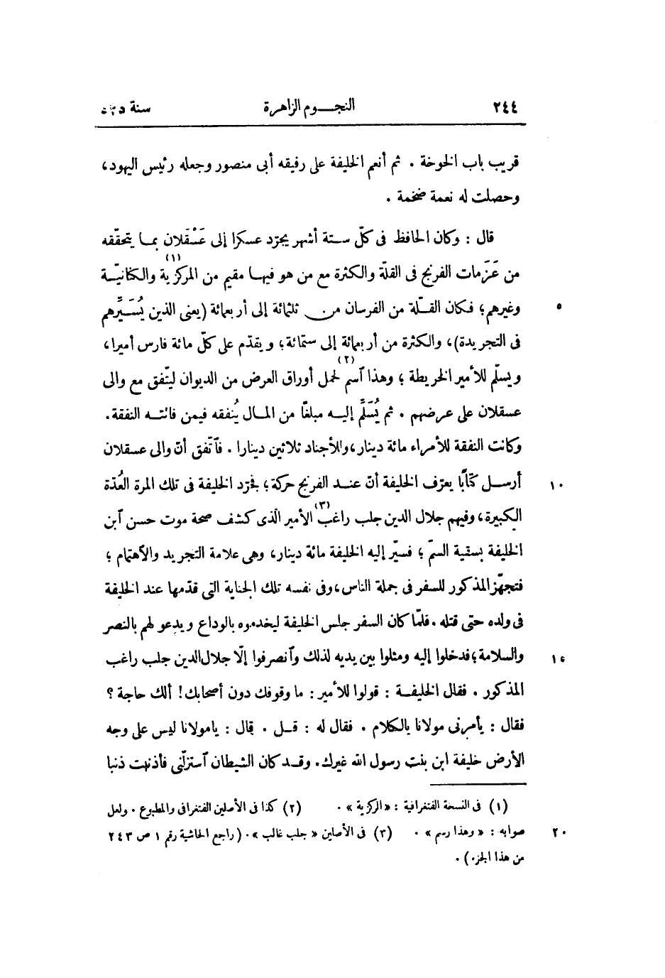 وكانت النفقة للأمراء مائة دينار، وللأجناد ثلاثين دينارا. فاتّفق أنّ والى عسقلان أرسل كتابا يعرّف الخليفة أنّ عند الفرنج حركة؛ فجرّد الخليفة فى تلك المرة العدّة الكبيرة، وفيهم جلال الدين جلب راغب «3» الأمير الذي كشف صحة موت حسن ابن الخليفة بسقية السمّ؛ فسيّر إليه الخليفة مائة دينار، وهى علامة التجريد والاهتمام؛ فتجهّز المذكور للسفر فى جملة الناس، وفى نفسه تلك الجناية التى قدّمها عند الخليفة فى ولده حتى قتله. فلمّا كان السفر جلس الخليفة ليخدموه بالوداع ويدعو لهم بالنصر والسلامة؛ فدخلوا إليه ومثلوا بين يديه لذلك وانصرفوا إلّا جلال الدين جلب راغب المذكور. فقال الخليفة: قولوا للأمير: ما وقوفك دون أصحابك! ألك حاجة؟