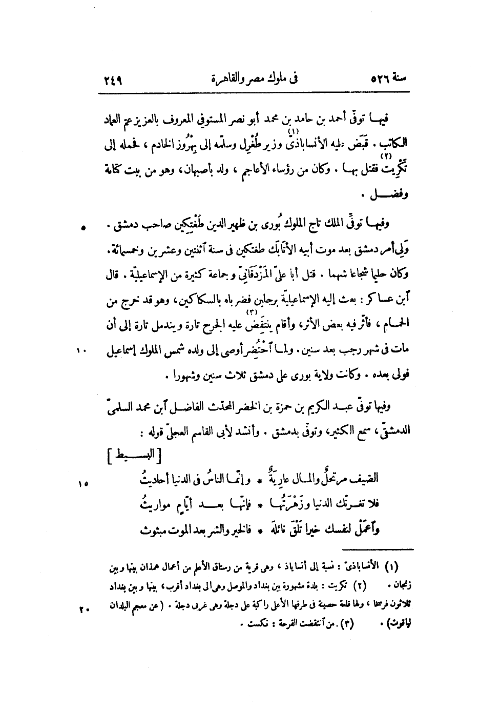 وكان حليما شجاعا شهما. قتل أبا علىّ المزدقانىّ وجماعة كثيرة من الإسماعيليّة. قال ابن عساكر: بعث إليه الإسماعيليّة برجلين فضرباه بالسكاكين، وهو قد خرج من الحمام، فأثّر فيه بعض الأثر، وأقام ينتقض «3» عليه الجرح تارة ويندمل تارة إلى أن مات فى شهر رجب بعد سنين. ولما احتضر أوصى إلى ولده شمس الملوك إسماعيل فولى بعده. وكانت ولاية بورى على دمشق ثلاث سنين وشهورا.