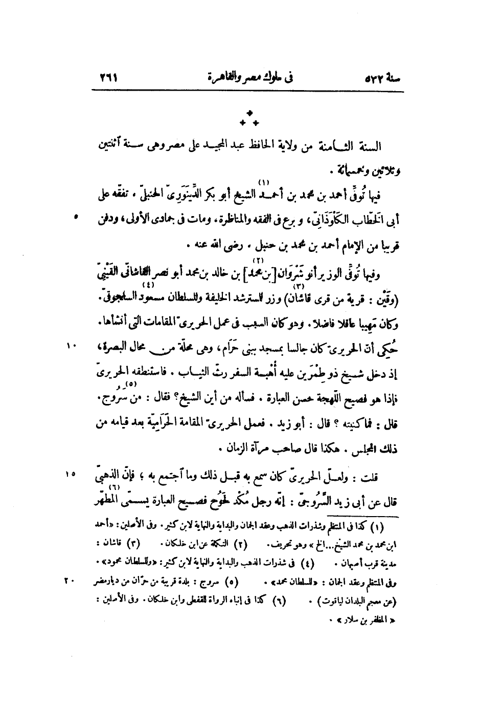 وفيها توفّى الوزير أنوشروان [بن محمد «2» ] بن خالد بن محمد أبو نصر القاشانىّ القينىّ (وقين: قرية من قرى قاشان «3» ) وزر المسترشد الخليفة وللسلطان مسعود «4» السلجوقىّ.