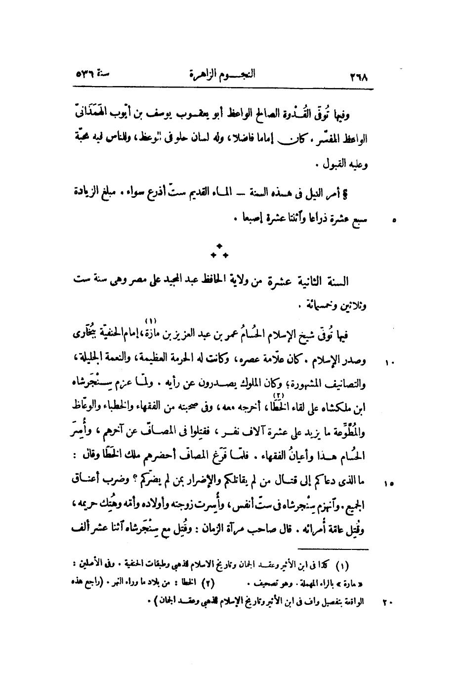 فيها توفّى شيخ الإسلام الحسام عمر بن عبد العزيز بن مازة «1» ، إمام الحنفيّة ببخارى وصدر الإسلام. كان علّامة عصره، وكانت له الحرمة العظيمة، والنعمة الجليلة، والتصانيف المشهورة؛ وكان الملوك يصدرون عن رأيه. ولمّا عزم سنجر شاه ابن ملكشاه على لقاء الخطا «2» ، أخرجه معه، وفى صحبته من الفقهاء والخطباء والوعّاظ والمطّوّعة ما يزيد على عشرة آلاف نفر، فقتلوا فى المصافّ عن آخرهم، وأسر الحسام هذا وأعيان الفقهاء. فلمّا فرغ المصافّ أحضرهم ملك الخطا وقال: