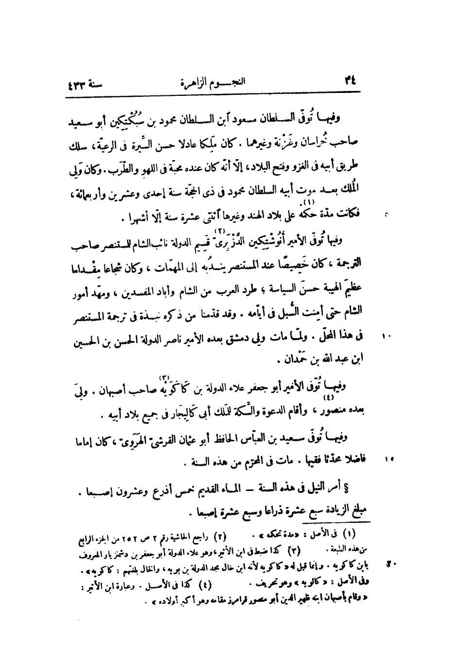 وفيها توفّى السلطان مسعود ابن السلطان محمود بن سبكتكين أبو سعيد صاحب خراسان وغزنة وغيرهما. كان ملكا عادلا حسن السّيرة فى الرعيّة، سلك طريق أبيه فى الغزو وفتح البلاد، إلّا أنّه كان عنده محبّة فى اللهو والطّرب. وكان ولى الملك بعد موت أبيه السلطان محمود فى ذى الحجّة سنة إحدى وعشرين وأربعمائة، فكانت مدّة حكمه «1» على بلاد الهند وغيرها اثنتى عشرة سنة إلّا أشهرا.