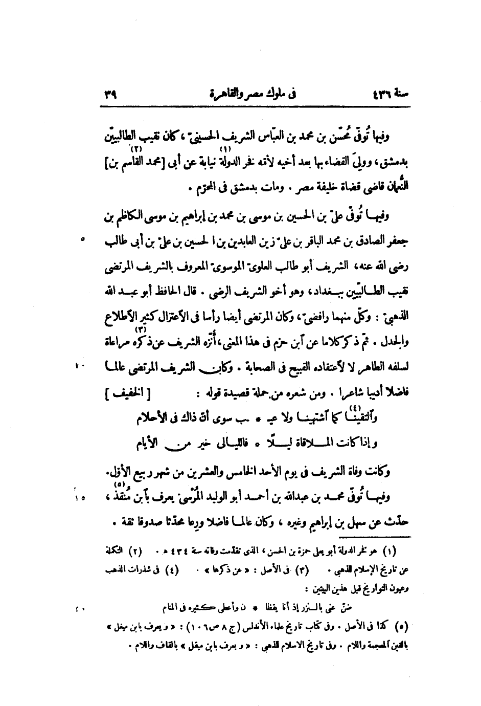 وفيها توفّى علىّ بن الحسين بن موسى بن محمد بن إبراهيم بن موسى الكاظم بن جعفر الصادق بن محمد الباقر بن علىّ زين العابدين بن الحسين بن علىّ بن أبى طالب رضى الله عنه، الشريف أبو طالب العلوىّ الموسوىّ المعروف بالشريف المرتضى نقيب الطالبيّين ببغداد، وهو أخو الشريف الرضى. قال الحافظ أبو عبد الله الذهبىّ: وكلّ منهما رافضىّ، وكان المرتضى أيضا رأسا فى الاعتزال كثير الاطلاع والجدل. ثمّ ذكر كلاما عن ابن حزم فى هذا المعنى، أنّزه الشريف عن ذكره «3» مراعاة لسلفه الطاهر لا لاعتقاده القبيح فى الصحابة. وكان الشريف المرتضى عالما فاضلا أديبا شاعرا. ومن شعره من جملة قصيدة قوله: