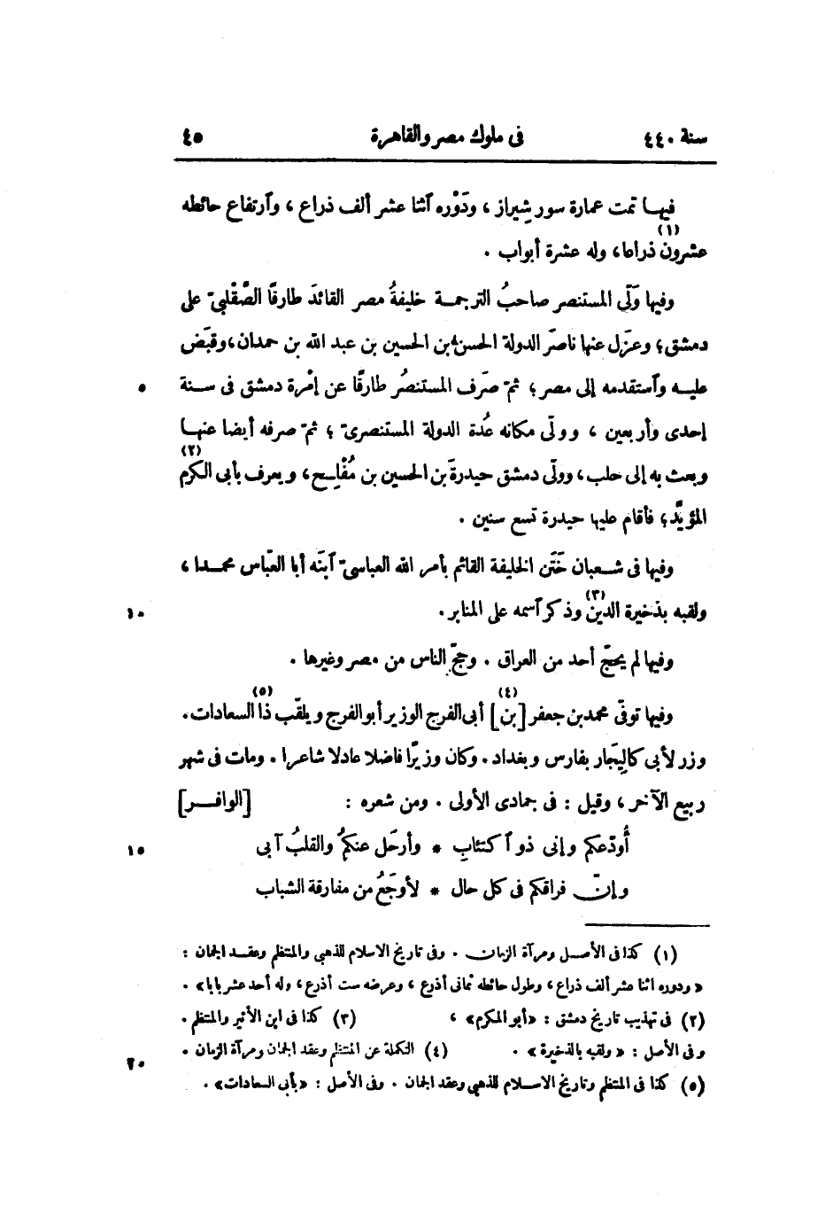 وفيها ولّى المستنصر صاحب الترجمة خليفة مصر القائد طارقا الصّقلبىّ على دمشق؛ وعزل عنها ناصر الدولة الحسن بن الحسين بن عبد الله بن حمدان، وقبض عليه واستقدمه إلى مصر؛ ثمّ صرف المستنصر طارقا عن إمرة دمشق فى سنة إحدى وأربعين، وولّى مكانه عدة الدولة المستنصرىّ؛ ثمّ صرفه أيضا عنها وبعث به إلى حلب، وولّى دمشق حيدرة بن الحسين بن مفلح، ويعرف بأبى الكرم «2» المؤيّد؛ فأقام عليها حيدرة تسع سنين.
