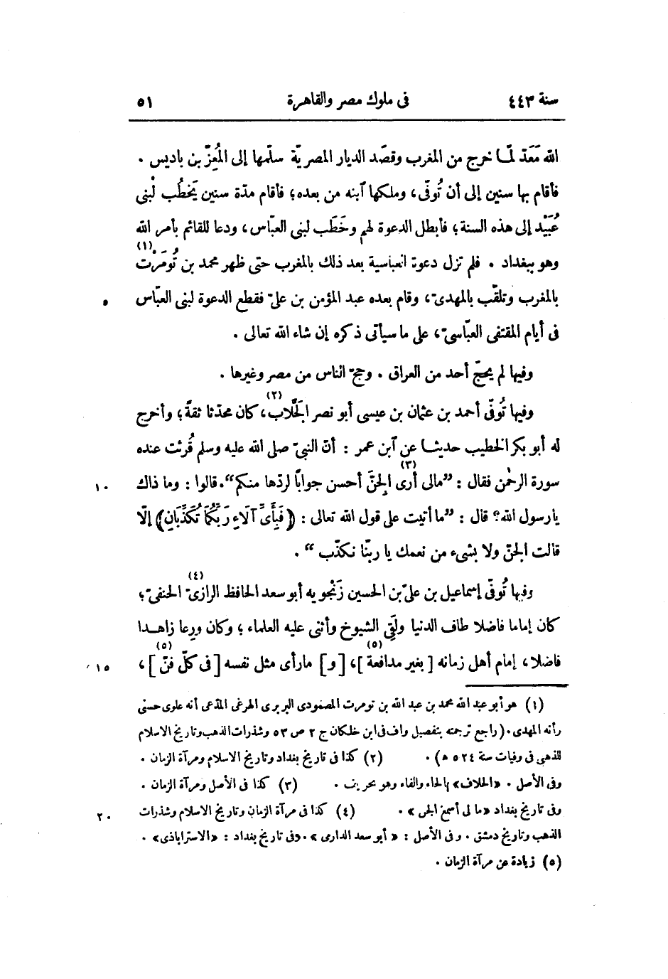 فأقام بها سنين إلى أن توفّى، وملكها ابنه من بعده؛ فأقام مدّة سنين يخطب لبنى عبيد إلى هذه السنة؛ فأبطل الدعوة لهم وخطب لبنى العبّاس، ودعا للقائم بأمر الله وهو ببغداد. فلم تزل دعوة العباسية بعد ذلك بالمغرب حتى ظهر محمد بن تومرت «1» بالمغرب وتلقّب بالمهدىّ، وقام بعده عبد المؤمن بن علىّ فقطع الدعوة لبنى العبّاس فى أيام المقتفى العبّاسىّ، على ما سيأتى ذكره إن شاء الله تعالى.
