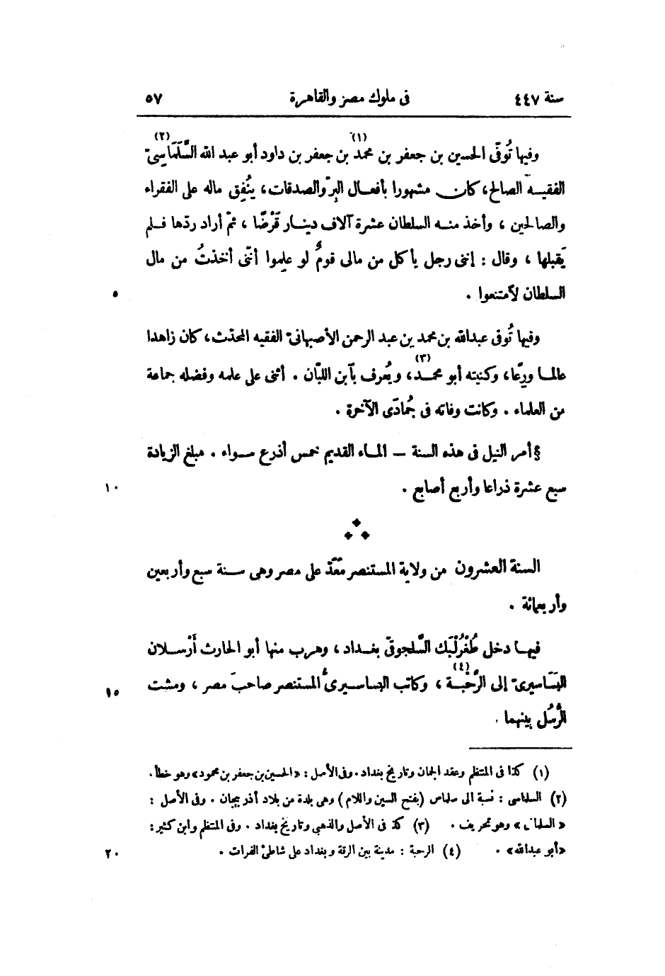 فيها دخل طغرلبك السّلجوقىّ بغداد، وهرب منها أبو الحارث أرسلان البساسيرىّ إلى الرّحبة «4» ، وكاتب البساسيرىّ المستنصر صاحب مصر، ومشت الرّسل بينهما.