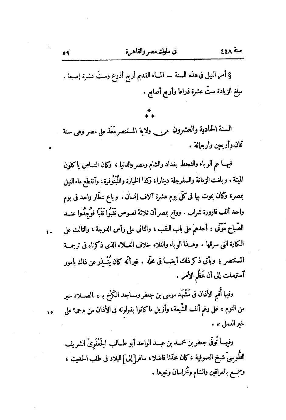فيها عم الوباء والقحط بغداد والشام ومصر والدنيا، وكان الناس يأكلون الميتة. وبلغت الرّمانة والسفرجلة دينارا، وكذا الخيارة واللّينوفرة، وانقطع ماء النيل بمصر، وكان يموت بها فى كلّ يوم عشرة آلاف إنسان. وباع عطّار واحد فى يوم واحد ألف قارورة شراب. ووقع بمصر أنّ ثلاثة لصوص نقبوا نقبا فوجدوا عند الصّباح موتى: أحدهم على باب النقب، والثانى على رأس الدرجة، والثالث على الكارة التى سرقها. وهذا الوباء والغلاء خلاف الغلاء الذي ذكرناه فى ترجمة المستنصر؛ ويأتى ذكر ذلك أيضا فى محلّه. غير أنّه كان ينذر عن ذاك بأمور استرسلت إلى أن عظم الأمر.