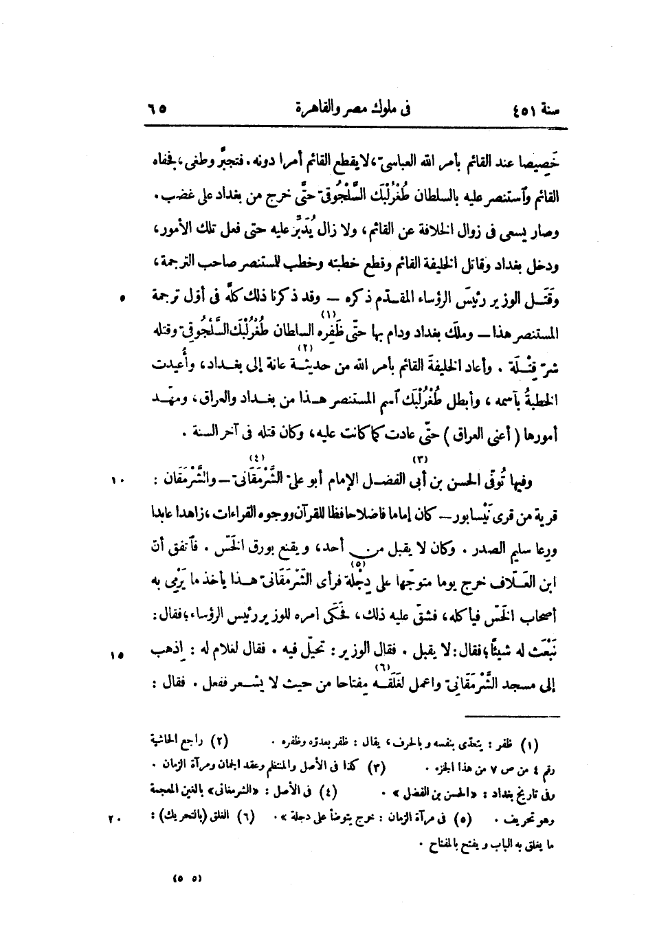 وصار يسعى فى زوال الخلافة عن القائم، ولا زال يدبّر عليه حتى فعل تلك الأمور، ودخل بغداد وقاتل الخليفة القائم وقطع خطبته وخطب للمستنصر صاحب الترجمة، وقتل الوزير رئيس الرؤساء المقدّم ذكره- وقد ذكرنا ذلك كلّه فى أوّل ترجمة المستنصر هذا- وملك بغداد ودام بها حتّى ظفره «1» السلطان طغرلبك السّلجوقىّ وقتله شرّ قتلة. وأعاد الخليفة القائم بأمر الله من حديثة «2» عانة إلى بغداد، وأعيدت الخطبة باسمه، وأبطل طغرلبك اسم المستنصر هذا من بغداد والعراق، ومهّد أمورها (أعنى العراق) حتّى عادت كما كانت عليه، وكان قتله فى آخر السنة.
