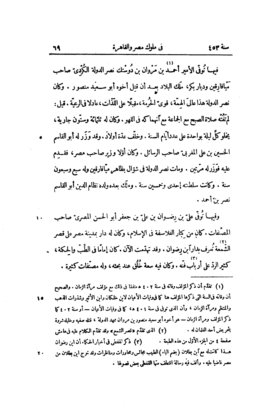 فيها توفّى الأمير أحمد «1» بن مروان بن دوستك نصر الدولة الكردىّ صاحب ميّافارقين وديار بكر، ملك البلاد بعد أن قتل أخوه أبو سعيد منصور. وكان نصر الدولة هذا عالى الهمّة، قوىّ الحرمة، مقبلا على اللّذّات، عادلا فى الرعيّة. قيل: