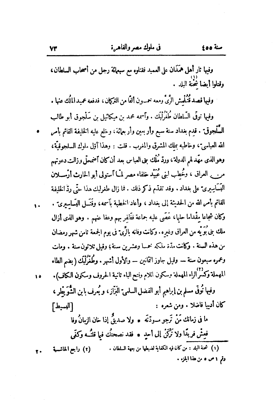 وفيها توفّى السّلطان طغرلبك. واسمه محمد بن ميكائيل بن سلجوق أبو طالب السّلجوقىّ. قدم بغداد سنة سبع وأربعين وأربعمائة، وخلع عليه الخليفة القائم بأمر الله العباسىّ، وخاطبه بملك المشرق والمغرب. قلت: وهذا أوّل ملوك السلجوقيّة، وهو الذي مهّد لهم الدولة، وردّ ملك بنى العباس بعد أن كان اضمحلّ وزالت دعوتهم من العراق، وخطب لبنى عبيد خلفاء مصر لمّا استولى أبو الحارث أرسلان البساسيرىّ على بغداد. وقد تقدّم ذكر ذلك. فما زال طغرلبك هذا حتّى ردّ الخليفة القائم بأمر الله من الحديثة إلى بغداد، وأعاد الخطبة باسمه، وقتل البساسيرىّ.
