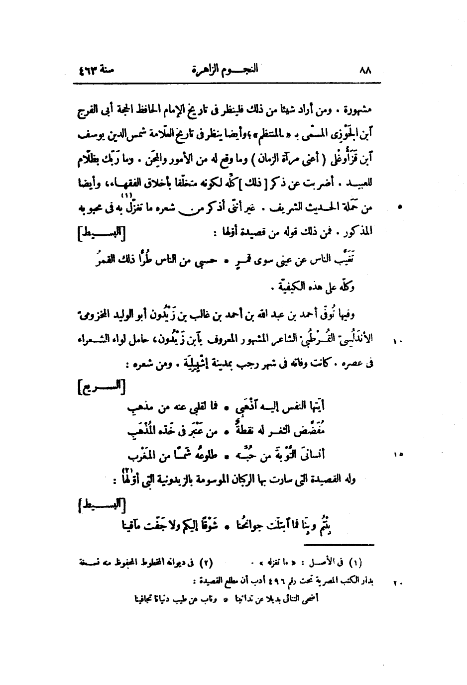 مشهورة. ومن أراد شيئا من ذلك فلينظر فى تاريخ الإمام الحافظ الحجة أبى الفرج ابن الجوزى المسمّى ب «المنتظم» ؛ وأيضا ينظر فى تاريخ العلّامة شمس الدين يوسف ابن قزأوغلى (أعنى مرآة الزمان) وما وقع له من الأمور والمحن. وما ربّك بظلّام للعبيد. أضربت عن ذكر [ذلك] كلّه لكونه متخلّقا بأخلاق الفقهاء، وأيضا من حملة الحديث الشريف. غير أنّنى أذكر من شعره ما تغزّل «1» به فى محبوبه المذكور. فمن ذلك قوله من قصيدة أوّلها: