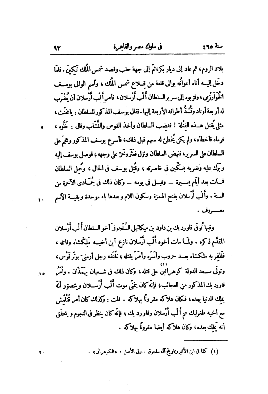 وفيها توفّى قاوردبك بن داود بن ميكائيل السّلجوقىّ أخو السلطان ألب أرسلان المقدّم ذكره. ولمّا مات أخوه ألب أرسلان نازع ابن أخيه ملكشاه وقاتله، فظفر به ملكشاه بعد حروب وأسره وأمر بقتله؛ فحنقه رجل أرمنىّ بوترقوس، وتولّى سعد الدولة كوهرائين «1» على قتله، وكان ذلك فى شعبان بهمذان. وأمر قاورد بك المذكور من العجائب؛ فإنّه كان يتمنّى موت ألب أرسلان ويتصوّر أنّه يملك الدنيا بعده، فكان هلاكه مقرونا بهلاكه. قلت: وكذلك كان أمر قتلمش مع أخيه طغرلبك عمّ ألب أرسلان وقاورد بك؛ فإنّه كان ينظر فى النجوم ويتحقّق أنه يملك بعده، وكان هلاكه أيضا مقرونا بهلاكه.