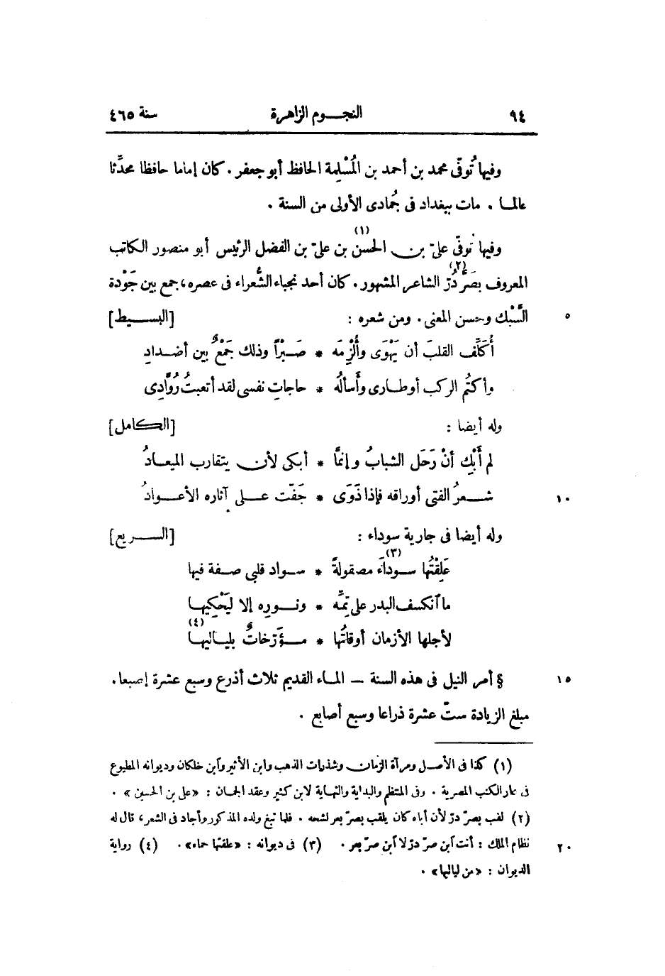 وفيها توفّى علىّ بن الحسن «1» بن علىّ بن الفضل الرئيس أبو منصور الكاتب المعروف بصرّدرّ «2» الشاعر المشهور. كان أحد نجباء الشّعراء فى عصره، جمع بين جودة السّبك وحسن المعنى. ومن شعره: