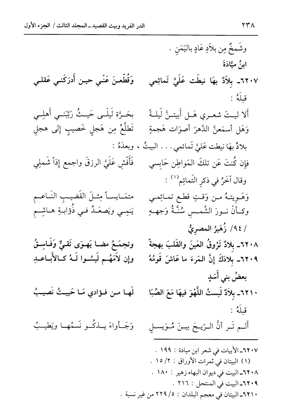 6207 - بِلَادٌ بهَا نيطَت عَلَيَّ تَمائِمي ... وَقُطّعنَ عَنّي حين أَدرَكني عَقلي